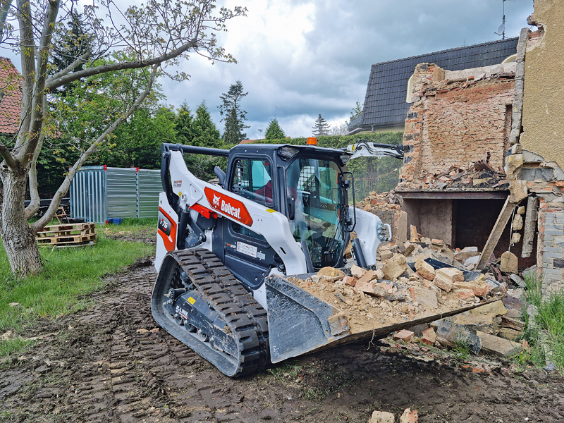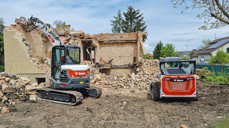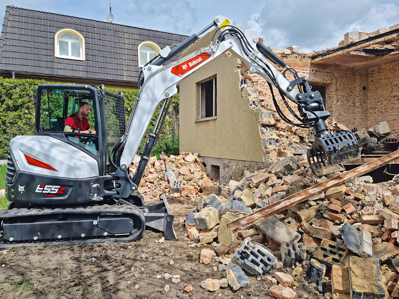 Der Abriss mit einem großen Bagger wäre schnell vonstatten gegangen, räumlich aber erwies sich diese Lösung als unrealistisch und die Arbeit mit einem Baggerlader würde zu lange dauern. Letztendlich entschied man sich für den Einsatz von zwei Maschinen mit aufgeteilten Aufgaben: Die Abrissarbeiten wurden mit dem neuen Bobcat-Minibagger E55z durchgeführt und die Schuttverladung mit dem ebenso neuen Bobcat-Kompakt-Raupenlader T76. Diese Kombination und der Einsatz spezieller Anbaugeräte erwiesen sich als effektiv: In sechs Stunden wurde das Haus komplett bis auf die Grundmauern abgerissen.