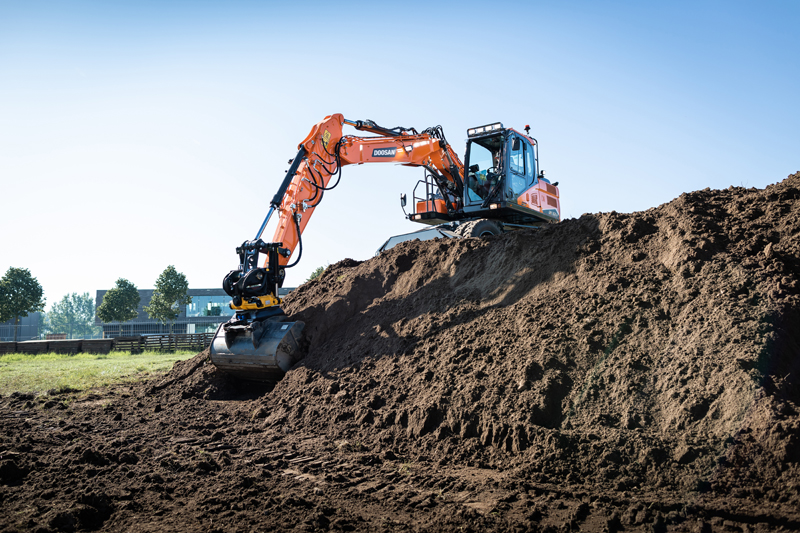 Zur Einhaltung der Abgasnorm der Stufe V werden die neuen Mobilbagger vom Doosan-Diesel DL06 der neuesten Generation angetrieben, der 102 kW (176 PS) bei 2 000 min¯¹ leistet. Der DL06-Motor übertrifft die Stufe-V-Emissionsvorschriften ohne Abgasrückführung (EGR), indem die beim Verbrennungsvorgang verfügbare Luftmenge erhöht wird, wodurch die Prozesstemperatur steigt und die Menge der erzeugten Partikel deutlich reduziert werden soll. Dies ist kombiniert mit einer DOC/DPF+SCR-Nachbehandlungstechnologie.