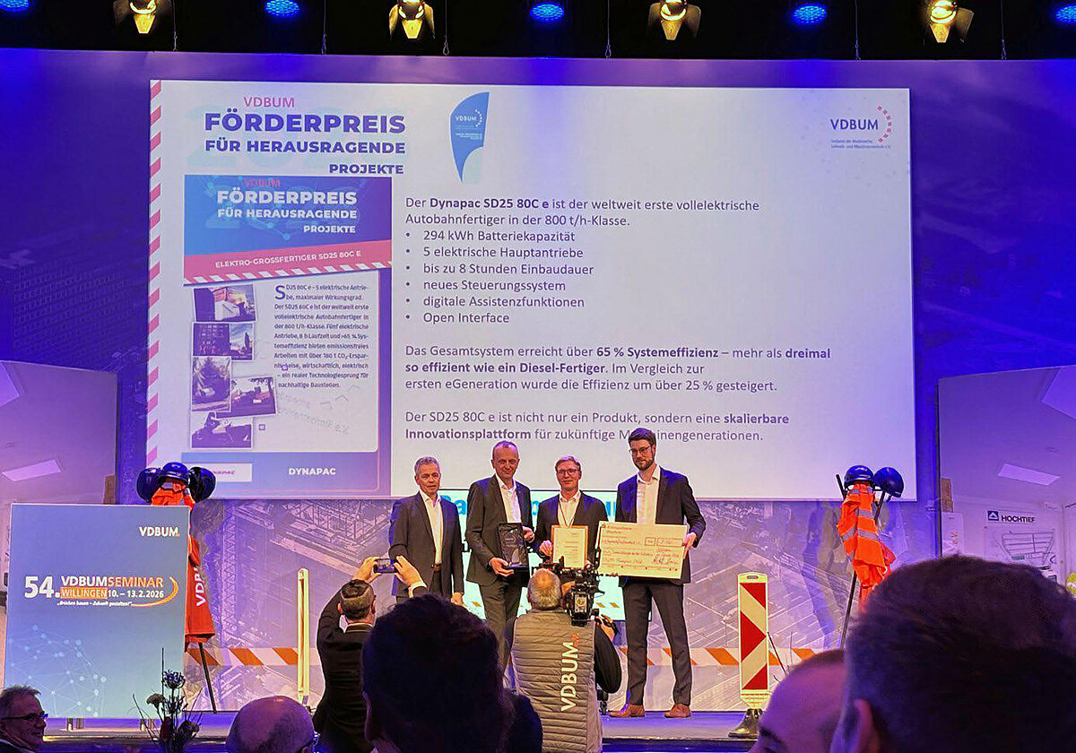 Dynapac ist mit dem 1. Platz des renommierten Förderpreises des VDBUM ausgezeichnet worden. In der Kategorie „Entwicklungen aus der Industrie“ überzeugte der vollelektrische Straßenfertiger SD25 80C e durch seine innovative Technologie und seine zukunftsweisende Ausrichtung. Der Preis wurde stellvertretend für das Unternehmen vom verantwortlichen Produktmanager Marten Buse entgegengenommen. „Diese Auszeichnung bestätigt unseren Anspruch, leistungsstarke und zugleich nachhaltige Lösungen für den Straßenbau zu entwickeln“, so Buse. Die Jury des jährlich vergebenen Preises bewertet die eingereichten Arbeiten nach den vier Kriterien, Nachhaltigkeit, Wirtschaftlichkeit, Technisch-Wissenschaftlicher Anspruch und Praxisrelevanz bzw. Zukunftsfähigkeit.