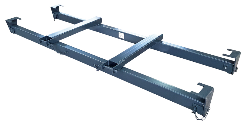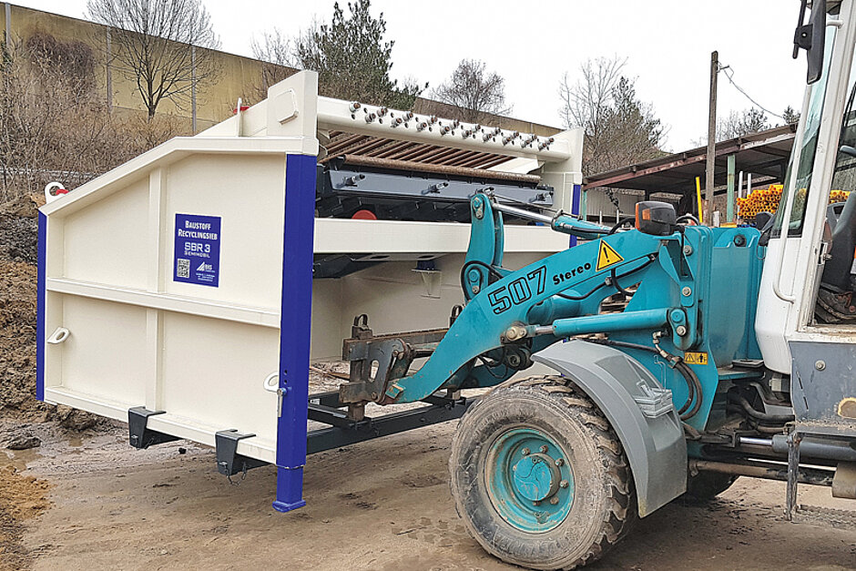Neu ist das Verladegestell zum sicheren Transport des Baustoff-Recycling-Siebs – einsetzbar mit allen bisher gefertigten Modellen der Baureihe SBR 3. Es ermöglicht die Verladung und den innerbetrieblichen Transport mit Radladern ab 5 t Betriebsgewicht auch in unwegsamem Gelände. Die Siebanlage und das Gestell auf den Gabeln des Radladers sind dabei in alle Richtungen durch die jeweilige Bolzenverriegelung gesichert.