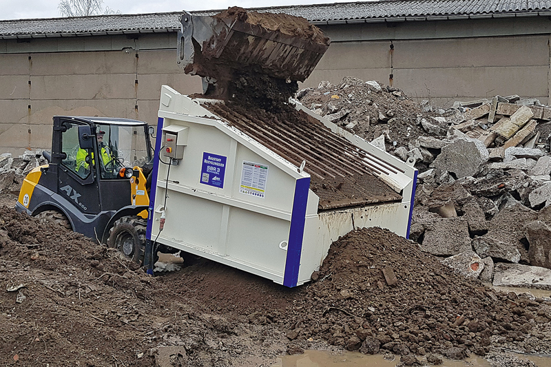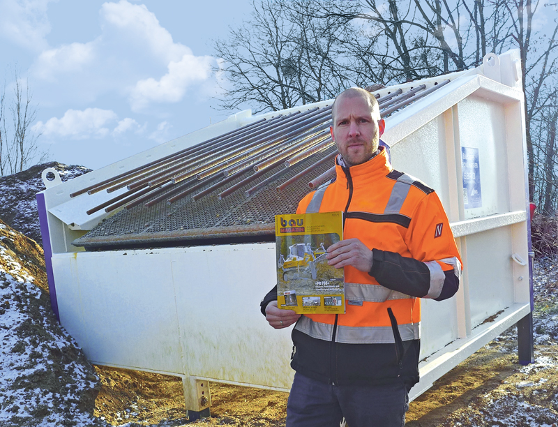 Beim Piloteinsatz stand die Absiebung von feuchtem, bindigem Mutterboden an. Die Anzahl der Sizer-Stangen wurde durch Herausnahme jeder zweiten halbiert, damit das schlecht fließende Material überhaupt zum Siebdeck gelangen konnte. Die Kombination aus Neigung und Drehrichtung des 2 kW starken Unwuchtmotors ermöglichte hier die entscheidende Einstellung. So wird eine lange Verweildauer des Siebguts auf dem Siebdeck erzeugt und das Überkorn zuverlässig separiert. »Das soll nicht heißen, dass es im Sommer nicht schneller und besser geht, aber wir zeigen, wie siebschwieriger Boden gesiebt wird«, betont Florian Schmellenkamp, Leiter Geschäftsentwicklung bei EAG Einfach Aufbereiten. t