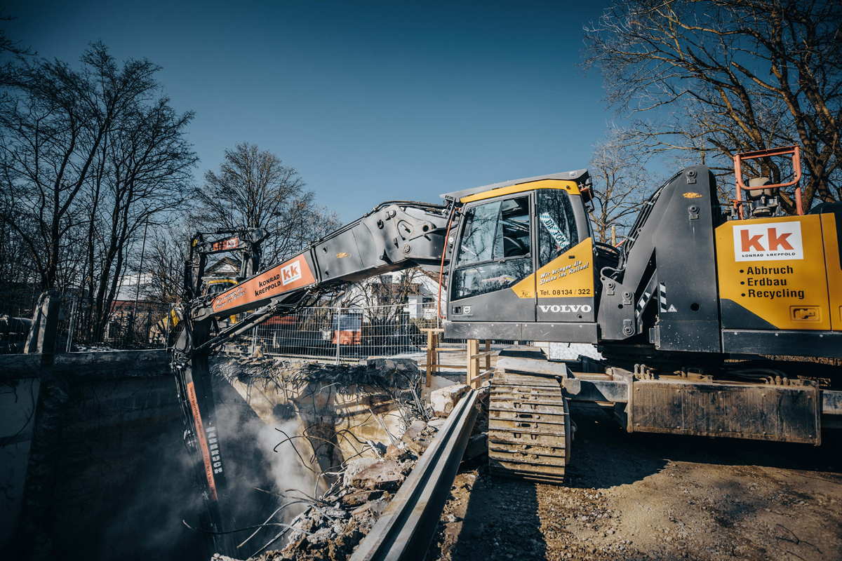 Wenn es auf der Baustelle richtig zur Sache geht, sind Präzision und Leistung gefragt. Für Konrad Kreppold, ein seit 55 Jahren auf Rückbau und Abbruch spezialisiertes Unternehmen mit Sitz in Odelzhausen, war klar: Ein Standardgerät reicht für ihre Arbeit nicht immer aus. Ziel war die Schaffung einer multifunktionalen Abbruch- und Erdbaumaschine, die sowohl den hohen Anforderungen an Reichhöhe, als auch an Flexibilität und Transportfähigkeit gerecht wird. Gemeinsam mit dem Umbauspezialisten Echle Hartstahl entstand aus einem Volvo EC300 EL ein individuell auf die Anforderungen zugeschnittener EHD 300 Abbruchbagger.