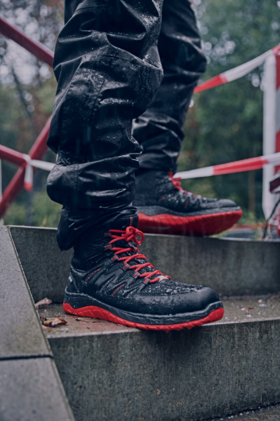Der von BASF entwickelte, elastische Partikelschaum ergänzt die Vorteile von TPU (Thermoplastisches Polyurethan) um die typischen Eigenschaften von Schaumstoffen. Das Ergebnis: elastisch wie Gummi, aber federnd leicht. Das Material dämpft den Aufprall des Fußes beim Laufen und federt ihn auch wieder zurück. Durch das hohe Rückstellungsvermögen erhält der Träger einen Großteil seiner eingesetzten Energie beim Laufen wieder zurück. Gerade Beschäftigte auf Baustellen, die bei ihrer Arbeit sehr viel laufen und auf harten Untergründen unterwegs sind, sollen damit Ermüdungserscheinungen und Gelenkproblemen deutlich besser vorbeugen können. Mit diesem Dämpfungskonzept ist die »Wellmaxx«-Serie von Elten ausgestattet. Modelle wie der »Maddox W black-red Low« sind zudem in zwei verschiedenen Weiten verfügbar, damit auch Beschäftigte mit breiteren Füßen von dieser Technologie profitieren können.