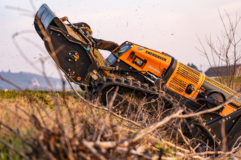 Energreen-Produkte stehen selbstredend auch bei den Energreen-Neuheitentagen im Fokus. An mehreren Wochenenden zwischen Mitte September und Anfang November erläutern die jeweiligen Vertriebspartner alles Wissenswerte rund um die Maschinen sowie die Anbaugeräte aus Cagnano. Neben den neuen Selbstfahrern der ILF-Reihe steht dann auch der komplett neu entwickelte RoboMIDI, der über einen bärenstarken 60-PS-Vierzylinder-Dieselmotor der Abgasstufe Stage V verfügt, im Rampenlicht. Aufgrund seiner kompakten Abmessungen, Wendigkeit und des überragenden Leistungsgewichtes erschließt der ferngesteuerte Geräteträger eine völlig neue Leistungskategorie. Er kann problemlos in besonders schwierigem sowie schwer zugänglichem Gelände mit Steigungen bis zu 50 Grad dauerhaft eingesetzt werden und bietet dabei noch mehr Leistung. Ausgestattet mit zwei doppelt wirkenden hydraulischen Steuergeräten, erweitert dieser neue Multifunktionsprofi das Leistungspotential mit z.B. Grasmulcher, Forstmulcher, Wurzelstockfräse oder Forstseilwinde über Arbeitsbreite und -geschwindigkeit in die obere Mittelklasse und erschließt damit neue Leistungs-Dimensionen.