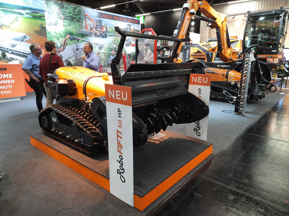 Ziel des Messeauftritts war auch, die hohe Flexibilität sowie die verschiedensten Lösungsmöglichkeiten der Energreen-Technik darzustellen. Denn Flexibilität bedeutet nun einmal Wirtschaftlichkeit. Diese Energreen-Maxime wollten die Gersthofener auch durch eine Vielzahl an unterschiedlichen Anbaugeräten für die ferngesteuerten Geräteträger der Robo-Klasse unterstreichen. Hierbei sei vor allem auch der RoboEVO inklusive Auslegerarm Trimmy bei den Experten auf enormen Zuspruch gestoßen. Durch dieses Maschinen-Geräte-System lasse sich eine Vielzahl an Anwendungen in der Landschaftspflege abdecken: Mähen, Schneiden oder Sägen, und zwar bis zu einer Höhe von 4,50 Metern.