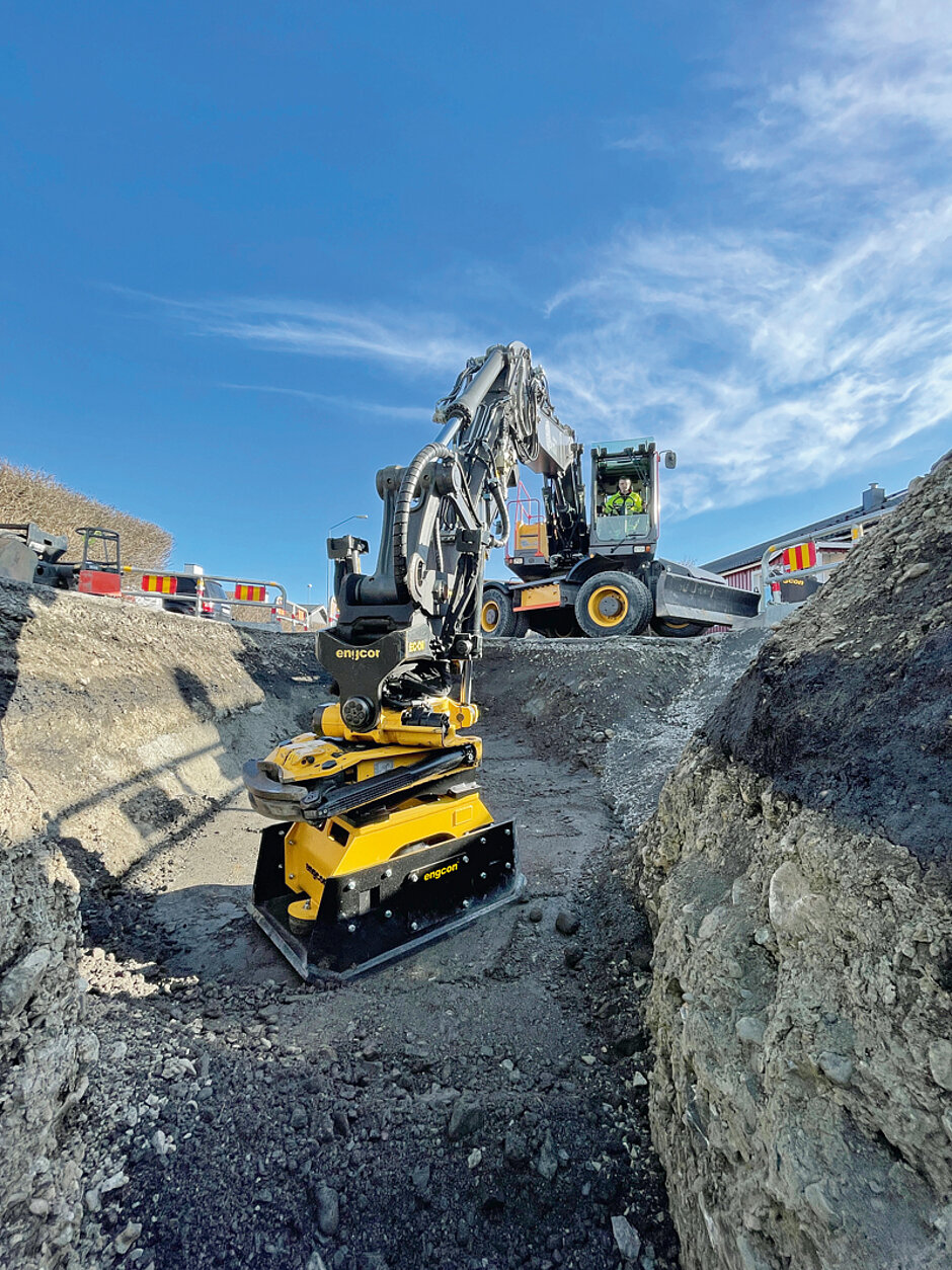 »Wir erhöhen mit dem neuen PC6000 die Flexibilität des Baggers, da der Baggerfahrer den Bodenverdichter beliebig kippen und drehen kann«, sagt Johan Johansson, Konstrukteur und Projektleiter des neuen Engcon-Bodenverdichters. »So ist es u. a. möglich, auch in den Randbereichen von Böschungen und Schächten den Boden zu verdichten, ohne ständig die Position der Maschine verändern zu müssen.«