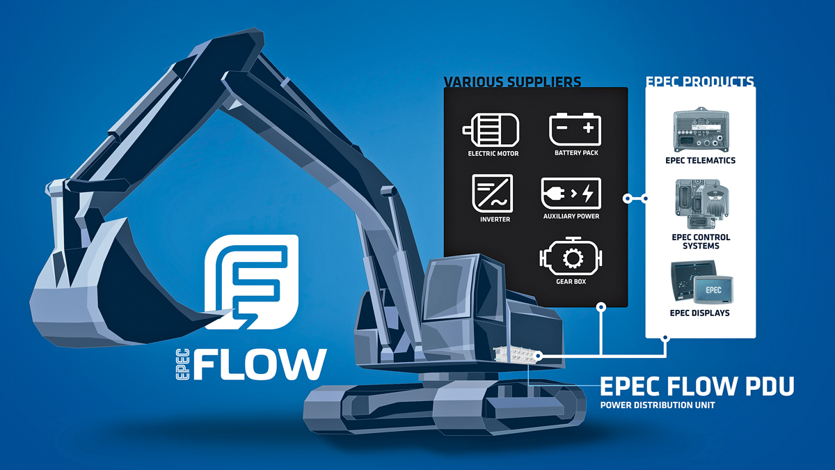 Im Mittelpunkt von Epec Flow stehen ein Steuersystem und eine Power Distribution Unit (PDU). Letztere verteilt die Energie für Fremdkomponenten wie E-Motoren und Batteriesysteme. Die integrierten Sicherheitslösungen der PDU sollen eine effektive Fertigung und Wartung der Maschinen sowie deren Betrieb unter anspruchsvollen Bedingungen ermöglichen. Die Epec Flow PDU lässt sich laut Anbieter zudem nahtlos in das Maschinensteuerungssystem integrieren, wodurch die Stromverteilung optimiert und automatisiert werden kann. Die Hybrid Control Unit (HCU) von Epec Flow steuert den elektrischen Antriebsstrang und enthält Software, die durch Simulationen entwickelt wurde und einen optimalen Energieverbrauch, Produktivität und Benutzerfreundlichkeit ermöglichen soll.