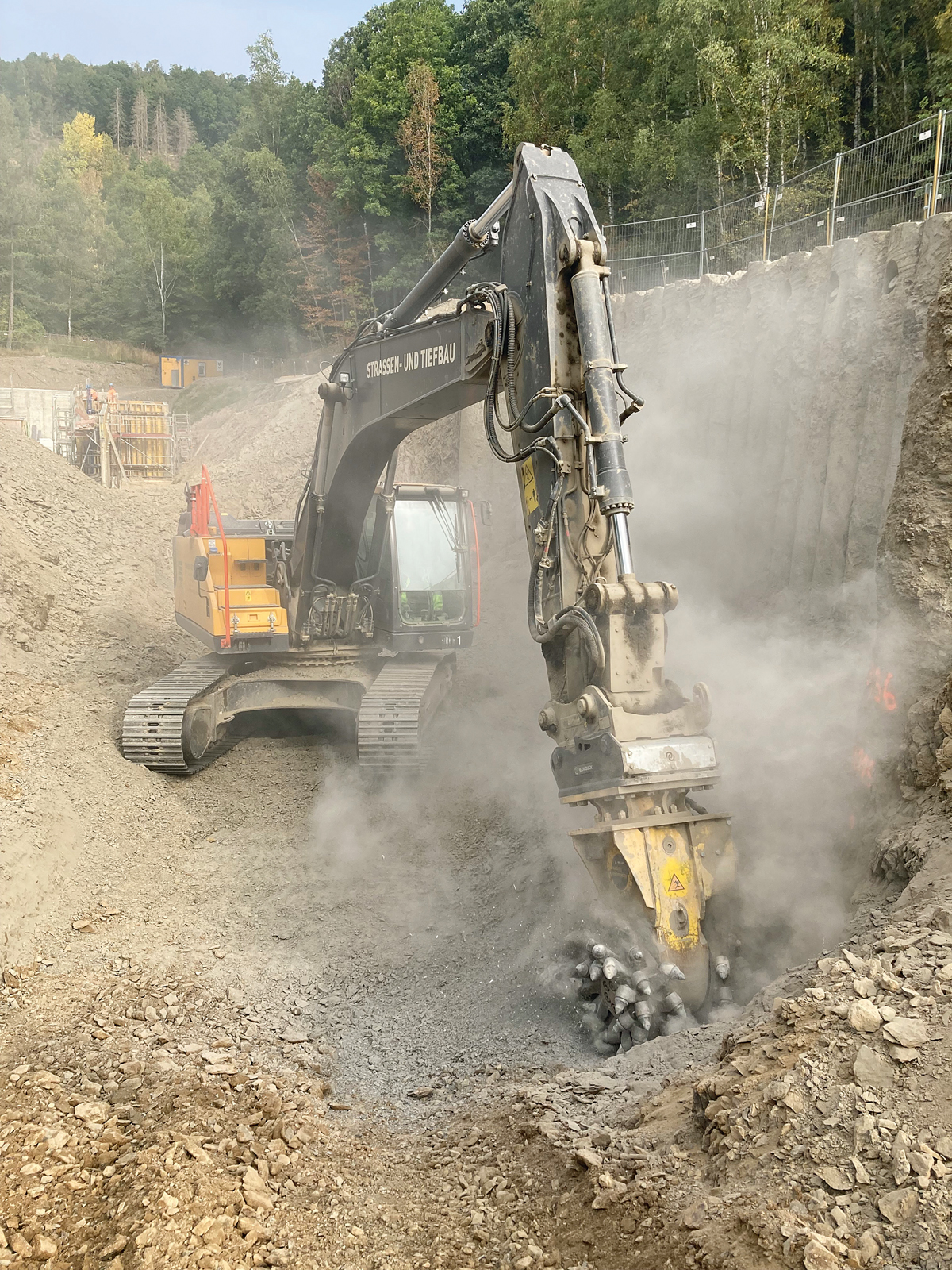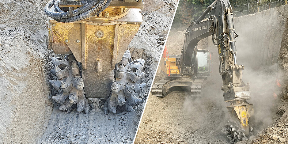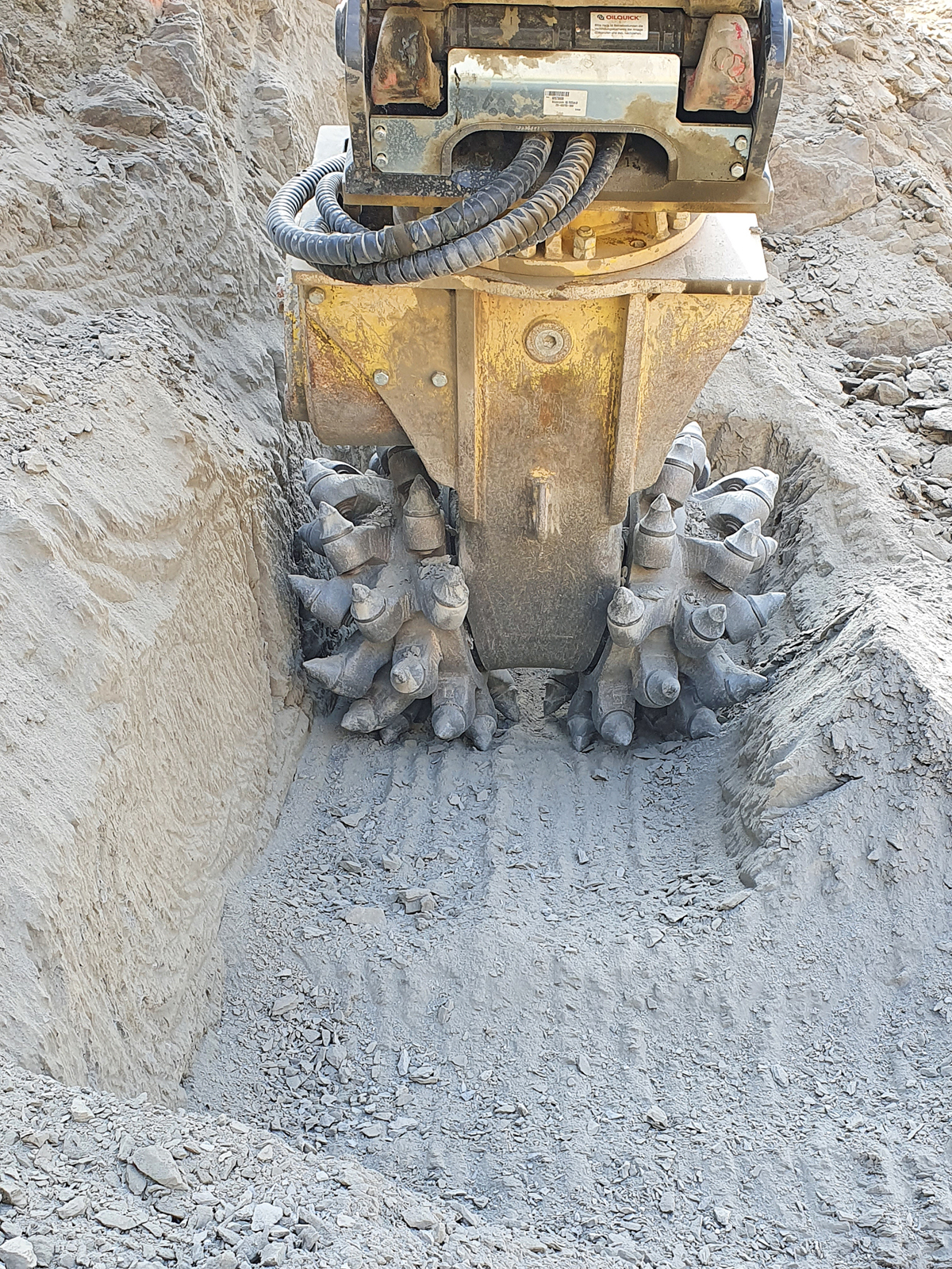 Selbstverständlich, so Epiroc weiter, könne die Fräse beim flächigen Materialabtrag trotzdem nach wie vor schwenkend wie eine alltägliche Querschneidkopffräse eingesetzt werden. Ein weiterer Vorteil der V-Technik ergebe sich beim regelmäßigen Graben für beispielsweise Versorgungsleitungen: Die Fräse kann dann einfach wie ein Grabenlöffel, der Richtung Bagger zeigt, arbeiten und tiefe, senkrechte Gräben in Gestein und Beton erzeugen. Diese Produktneuheit funktioniert auch unter Wasser und lässt sich ohne zusätzliche Installation oder Modifikation bis zu einer Tiefe von 30 Metern verwenden.