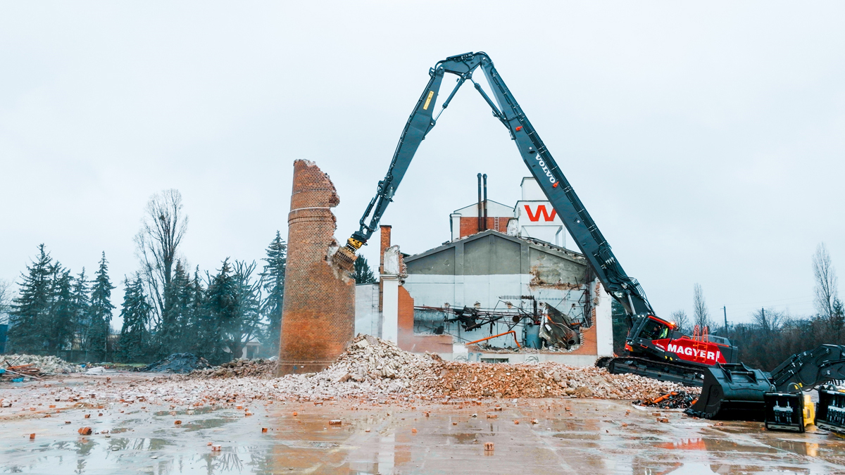 Der Abbruch ist, neben Kies-, Schotter- und Sandabbau, sowie Erdbau und Deponiebau, seit 15 Jahren ein wichtiges Standbein der Magyer Betriebs GmbH. Das Bauunternehmen investiert in seine Flotte, so zum Beispiel in den neuen EC 750E High Reach Abbruchbagger von Volvo. Mit diesem Gerät, ausgerüstet mit einem Multigreifer der Firma Epiroc, konnte auf einem 72.000 m2 großen Baustellenareal im Süden Wiens innerhalb von 30 Minuten ein 36m hoher Schornstein abgebrochen werden. „Das ist der Beginn von etwas Großem, denn der Schornsteinabbruch ist nur der Anfang und es werden viele weitere große Abbruchprojekte folgen“, erklärt Marcel Magyer, Geschäftsführer der Magyer Betriebs GmbH.