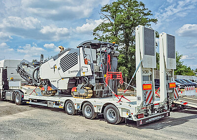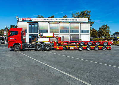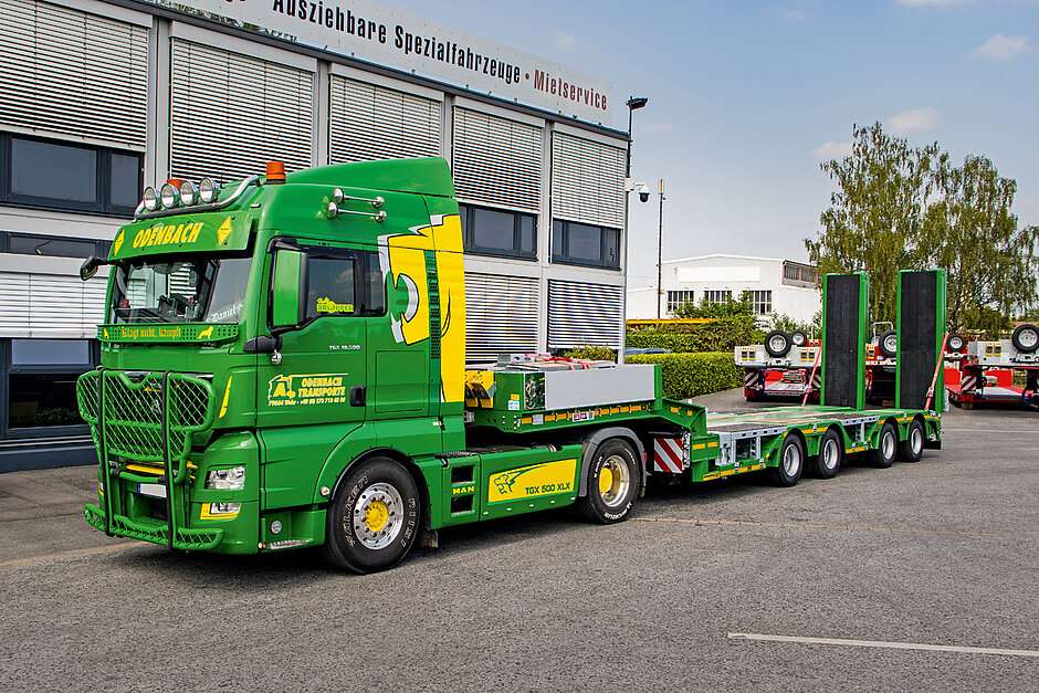 Der »MultiMAX« wurde speziell auf die Transportbedürfnisse von Odenbach Transporte abgestimmt. Der vierachsige Satteltieflader überzeugt durch seine robuste Bauweise und vielseitige Ausstattung. Aufgrund der teleskopierbaren Ladefläche und der integrierten Radmulden eignet sich der Auflieger ideal für den sicheren Transport schwerer Baumaschinen und Fahrzeuge mit großen Radlasten. Das technisch mögliche Gesamtgewicht beträgt 65 t, die Nutzlast liegt bei bis zu 51,8 t.