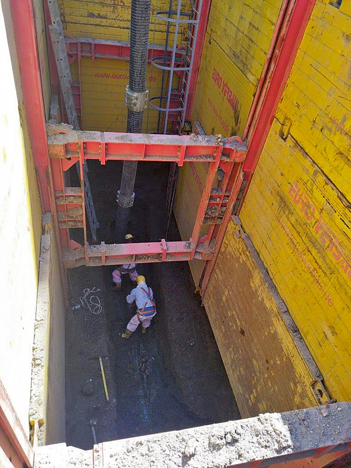 Als Lösung für solche Tiefen lieferte Euro Verbau ein Doppel-Gleitschienen-System im Parallelverbau, kurz »DGPV«, in die Via dei Gordani. Auf einer Länge von 9 m wurde das System eingesetzt und immer wieder verschoben, sodass der neue Kanal reibungslos verlegt und mit dem alten Kanalsystem verbunden werden konnte. Dabei meisterte das »DGPV«-System noch eine zweite Herausforderung, die typisch für Rom ist: Die Stadt ist sehr dicht bebaut, entsprechend stabil muss eine solche Baustelle sein. »Eine Herausforderung, die wir fast im gesamten Stadtgebiet von Rom antreffen«, erklärt Marco Verstraaten. »Der Boden darf sich auf keinen Fall absenken, das birgt die Gefahr von Rissen und kann die alten Fundamente der umliegenden Gebäude beschädigen.« Das stabile »DGPV«-System, das u. a. über eine noch stärkere Version der Gleitschienen mit Spindelaussteifung verfügt, sorgte dafür, dass die Stabilität des Erdreichs und der Fundamente gewahrt blieb.d