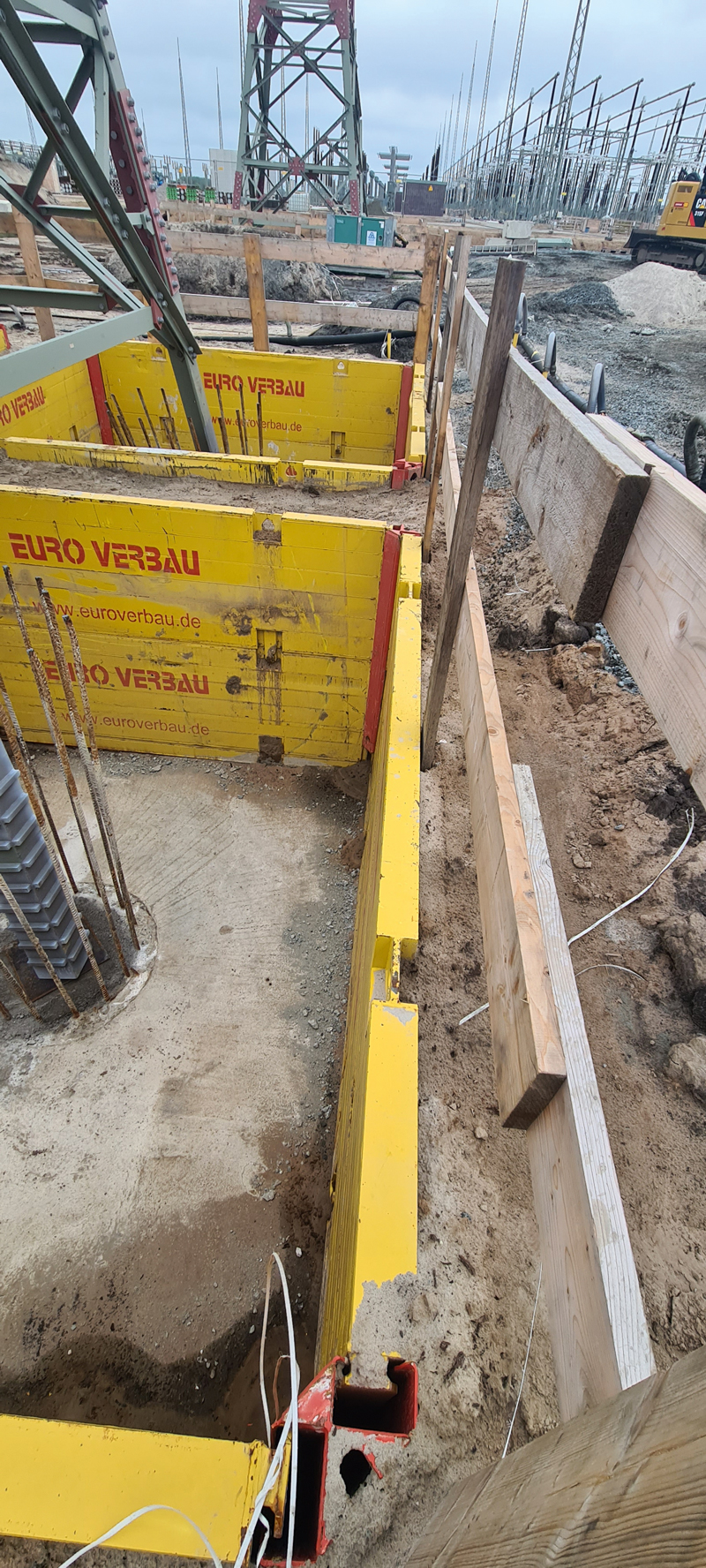 Um die Fundamente zuverlässig zu erstellen, hebt Herzog mit seinem Team für jedes Maststandbein eine 4 m x 4 m breite und 2,4 m tiefe Grube aus. Für die Gründung der Masten werden je nach Bodenbeschaffenheit zuerst Ramm- und Bohrpfähle tief in den Boden getrieben, später wird um die Pfähle herum die Grube mit Beton verfüllt. Auf den gekappten Enden der Pfähle werden dann die Stahlgestelle aufgebaut.