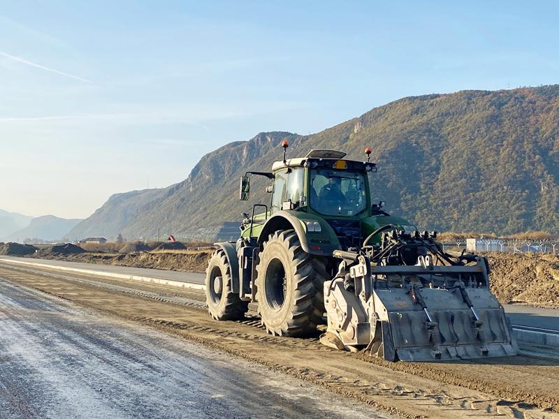 Eine Stabilisierungs- und Multifunktionsfräse des FAE-Typs MTH war für Stabilisierungsarbeiten am Flughafen von Bozen gefordert. Ausführende Unternehmen für die Arbeiten an der Start- und Landebahn war die Firma Brunner & Leiter aus dem Ahrntal bei Bozen. »Die FAE MTH wurde mit einem Fendt-Traktor des Typs 1038 eingesetzt, um eine Fläche von 11 000 m² bis in 25 cm Tiefe zu stabilisieren«, berichtet der Bauleiter von Brunner & Leiter. »Die Maschine hätte auch in einer größeren Tiefe arbeiten können, aber das Leistungsverzeichnis gab vor, diese Marke einzuhalten. Das Gelände war nicht besonders schwierig zu bearbeiten, enthielt jedoch einige mittelgroße Steine, die der MTH keinerlei Probleme bereitet haben.«