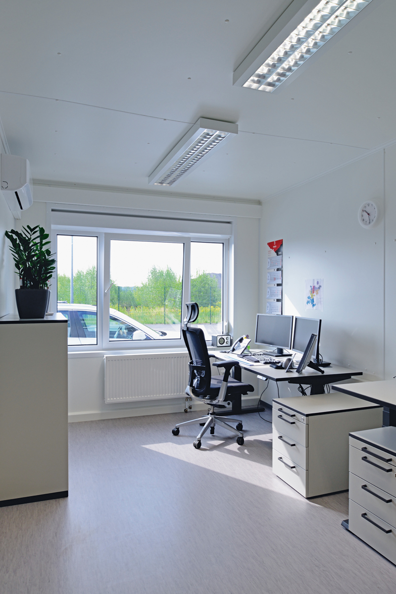 Für unterschiedliche Einsatzzwecke der Container will FAGSI die jeweils passende Baureihe bieten. ProBasic-Container erfüllen alle gängigen Brand- und Schallschutzvorschriften und ermöglichen die Gestaltung großzügiger Räume, wie auch das Lagergebäude in Lünen. ProEnergy hingegen ist ein besonders energieeffizienter Container von FAGSI. Er wird für komplexe Anlagen mit hohem Qualitätsanspruch verwendet, und kam deshalb beim neuen Bürogebäude zum Einsatz. Er berücksichtigt als ein besonders energieeffizienter Container die aktuelle Energieeinsparverordnung EnEV für Gebäudestandzeiten über 24 Monate und will durch geringe Betriebskosten überzeugen. ProEnergy-Container können mit regenerativen Energiequellen gekoppelt werden und erfüllen somit das Erneuerbare-Energien-Wärme-Gesetz. Im Bürogebäude wurde eine moderne Gas-Brennwert-Zentralheizung mit integrierter Warmwasserbereitung installiert. Außerdem gibt es Split-Klimageräte mit Wärmepumpentechnik für die Büroräume und den Besprechungsraum.