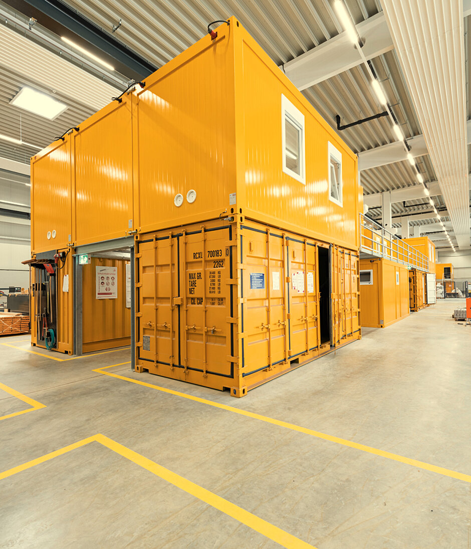 Die Container der Erdgeschossebene sind in zwei Reihen an einem mittigen Durchgang platziert und mit weiteren Containern im Obergeschoss überbaut. Diese Überbauung sowie der Wunsch der Bauherren nach drei zur Halle hin offenen »Werkstattkabinen« erforderte die Ausbildung einer tragenden Stahlunterkonstruktion als Basis, die an die Container-Abmessungen angepasst werden musste. Die obere Etage wird über außenliegende Treppen erreicht.