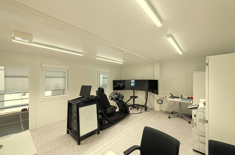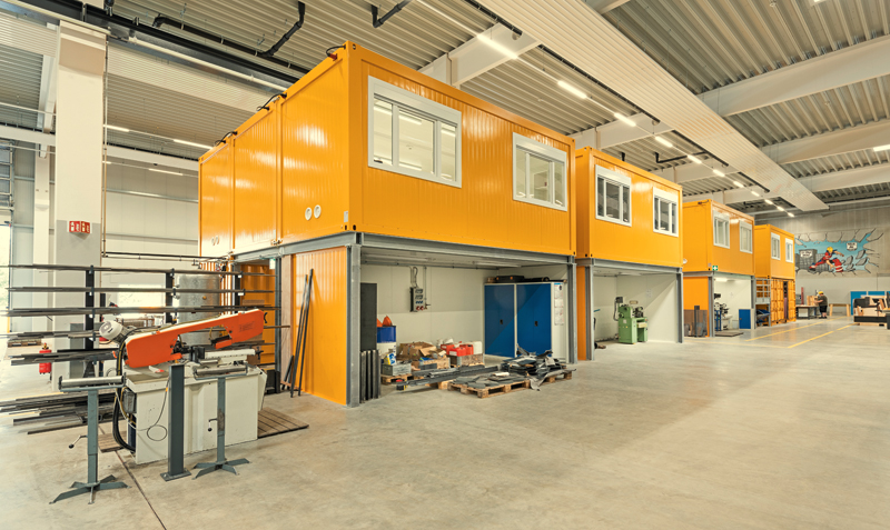 Unmittelbar in die Ausbildungshalle integriert, ergänzt eine zweistöckige, 295 m² große Anlage aus 20 Fagsi-Kauf-Containern das Raumangebot um sechs rund 14 m² große Materiallager und sanitäre Anlagen im Erdgeschoss. Im Obergeschoss sind zwei Büros, drei Besprechungsräume – zwischen 28 m² und 42 m² groß – sowie ein 28 m² großer Raum für Messtechnik untergebracht.