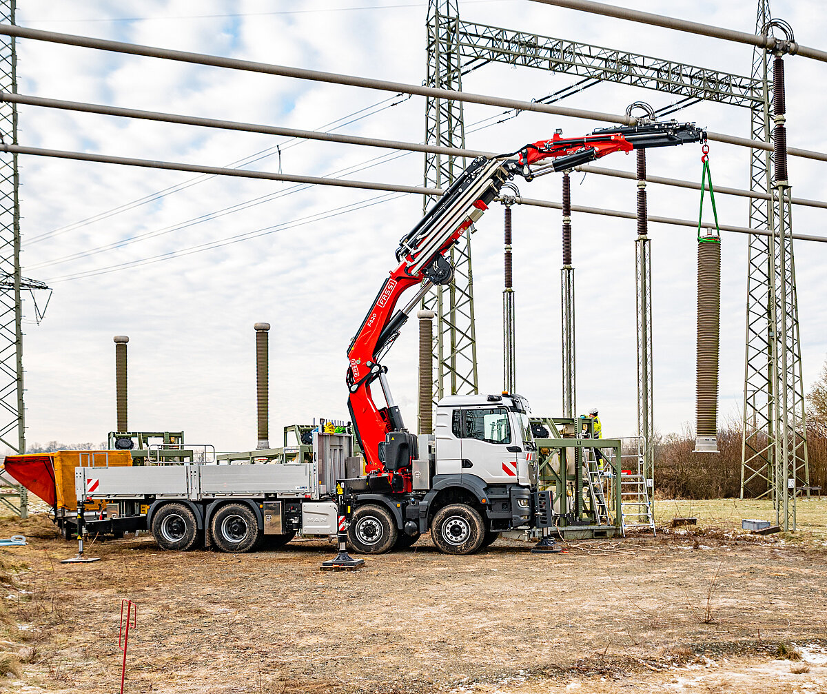 Mit einem Hubmoment von 80 tm / 785 kNm und einer maximalen hydraulischen Ausladung bis 26,50 m – durch ein zusätzliches Knickarmsystem (Jib) – kann der Fassi-Ladekran anspruchsvolle Hebeaufgaben erfüllen. Ein bemerkenswerter Einsatz dieses Kranes unterstützte das TenneT-Team bei der Demontage eines mobilen 380-kV Schaltfeldes, um dieses transportfähig zu machen. Danach wurde es in ein anderes Umspannwerk transportiert und kommt dort wieder zum Einsatz.