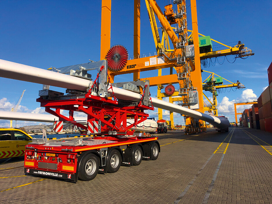 Windflügeltransporte mit einer Nachläuferkombination können die Wendigkeit im Vergleich zu teleskopierbaren Fahrzeugen deutlich erhöhen. Seinen Windflügeladapter sieht Faymonville mit einer Hublast von 30 t bereits heute auf Rotorblattgewichte von morgen ausgelegt. Je nach Konfiguration wird ein Hub von bis zu 1 700 mm erreicht, um Hindernisse während des Transports zu überfahren.
