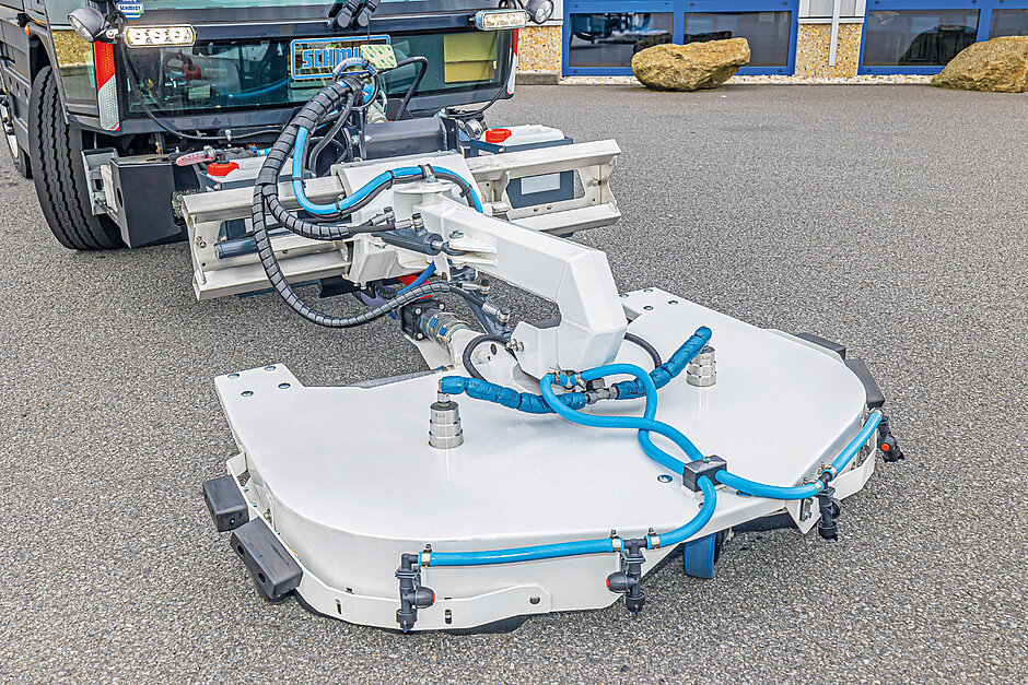 Der Flächenreiniger FFR 1200 verfügt über zwei vierfach gelagerte Rotorarme, die mit bis zu 350 bar als Heiß- und Kaltwasserreiniger arbeiten können. Besonders stark verunreinigte Flächen – beispielsweise Ölspuren – können vorab per Sprühleiste benässt werden.