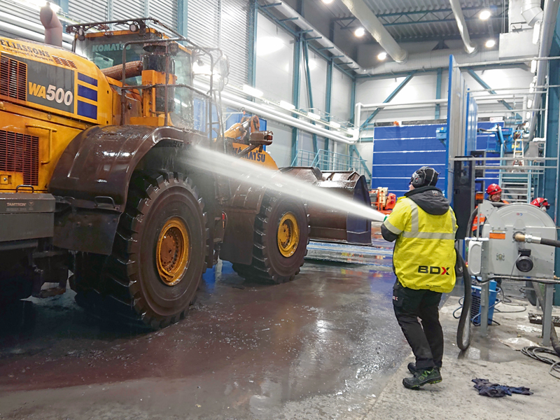 Das Eisenerz-Bergwerk Kiruna gehört zum schwedischen Bergbaukonzern LKAB und fördert jährlich mehr als 30 Mio. t Roherz im Untertagebau. Kiruna ist die nördlichste Stadt Schwedens und liegt nördlich vom Polarkreis. Vor rund drei Jahren startete das Unternehmen mit der Planung einer modernen Wasch-, Service- und Reparaturhalle, ausgelegt, um aus dem riesigen Fuhrpark täglich bis zu 50 Maschinen abzufertigen. Da die Bodenverhältnisse unter Tage in den großflächigen Aufschlüssen und auf oft unbefestigten Transportstraßen eine massive Verschmutzung an Rad- und Kettenfahrzeugen verursachen, sind Service- und Reparaturarbeiten ohne eine gründliche Reinigung der Fahrzeuge kaum möglich.