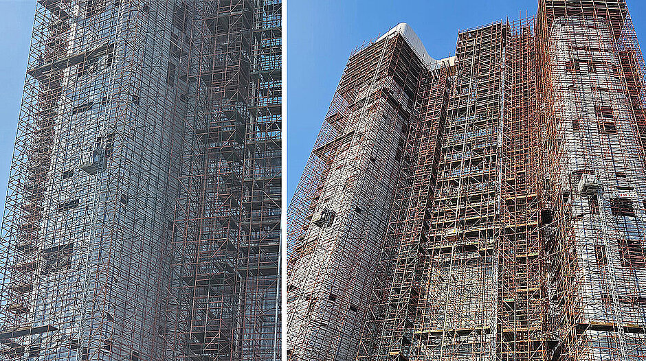 Im Fokus steht die Sanierung des Hochhauses „Oceans Building“, Teil der bekannten Oceans Mall. Das Gebäude wurde für die umfangreichen Arbeiten vollständig eingerüstet – ein logistisches Mammutprojekt, das durch das Know-how „Made in Germany“ maßgeblich unterstützt wird. Gemeinsam mit dem langjährigen Partnerunternehmen SkyJacks lieferte Geda zwei Geda 500 Z/ZP Transportbühnen sowie einen Geda 300 Z Materialaufzug. SkyJacks übernahm dabei die Vermietung und Betreuung der Geräte vor Ort.