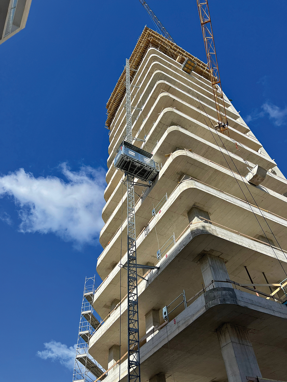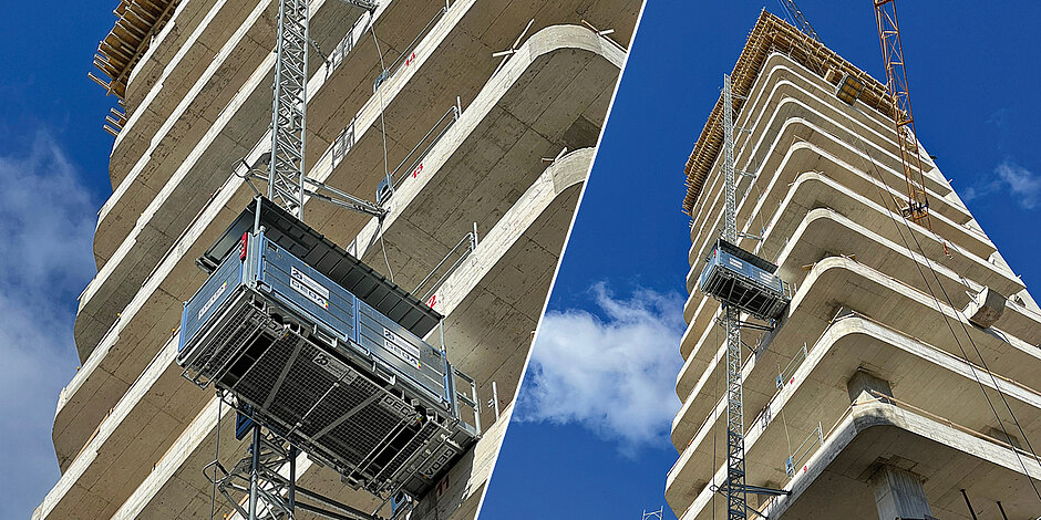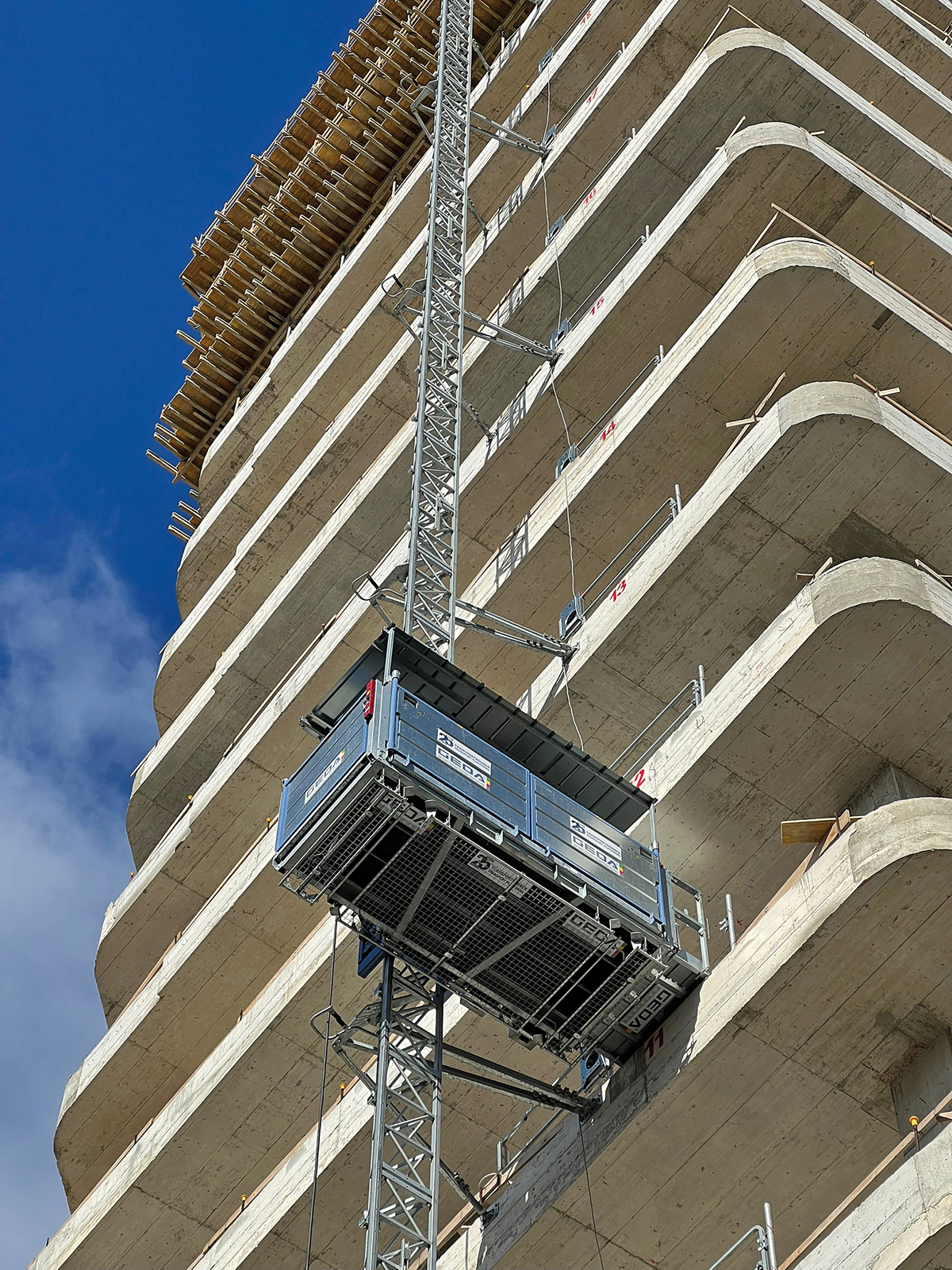 Bei diesem Bauwerk muss die Transportbühne 17 Stockwerke bedienen und eine Förderhöhe von 85 m bewerkstelligen. Mit einer maximalen Förderhöhe von 130 m deckt der GEDA 1200 Z/ZP diese Vorgaben ab. Das große Ladevolumen von 1 500 kg erlaubt, viele Baumaterialien zügig und sicher an ihren Einsatzort zu transportieren. Das spart nicht nur Zeit, sondern auch Geld bei jedem Bau.