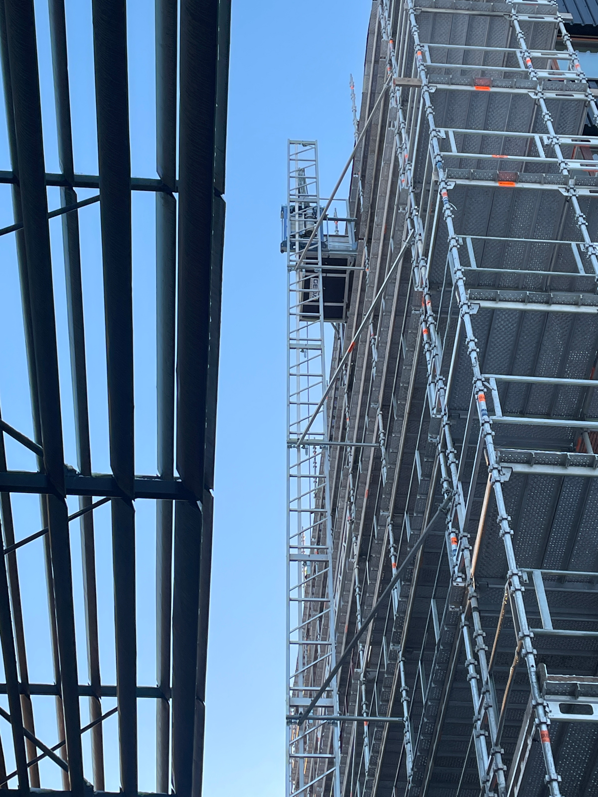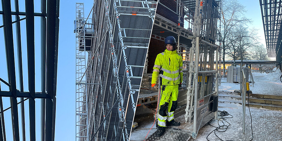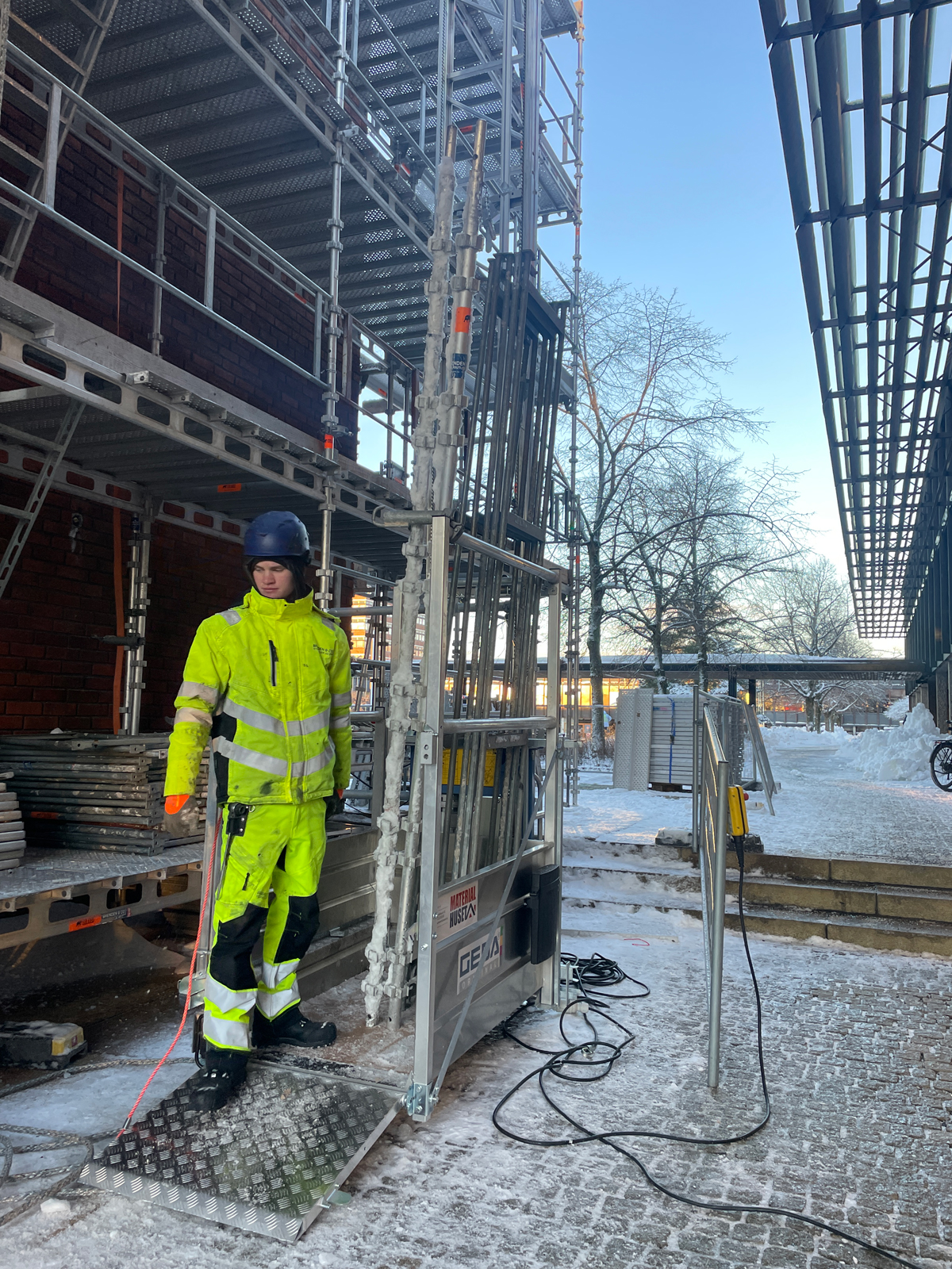 Auf der nächsten Baustelle in Norwegen, ebenfalls in Oslo, kommt der neue Geda Materialaufzug erneut zum Einsatz. Hier erreicht das Gerüst eine Höhe von 50 m. Für den Aufbau des HAKI- und Solideq-Gerüsts wurde der Materialaufzug bis zu einer Förderhöhe von 30 m eingesetzt. Der Einsatz erfolgte in enger Zusammenarbeit mit dem Unternehmen Brenden & Co. Gerüstverleih (Brenden og Co. stillas utleie AS. Der Geda 200 Z Comfort stellt ein wichtiges Beispiel für die Rentabilität von neuen Geräten in der Mietflotte von Vermietern dar.