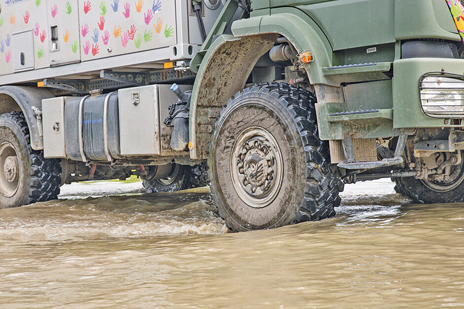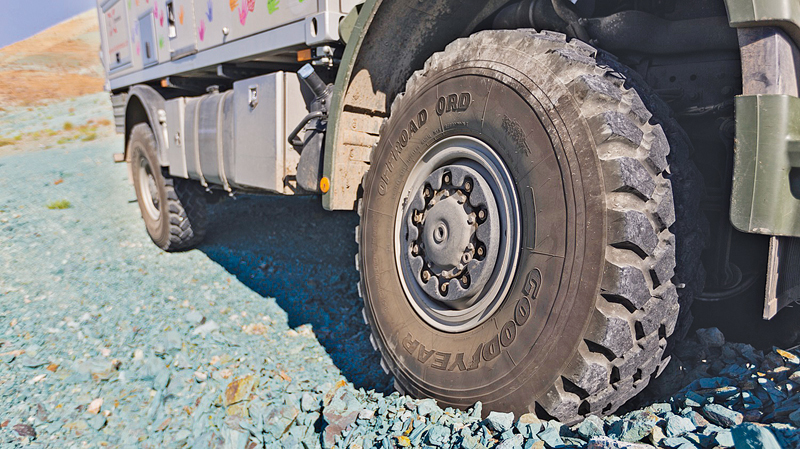 »47 000 km ohne eine einzige Reifenpanne – das ist unglaublich«, begeistert sich Mike Kammermann. Insgesamt sechs Offroad-ORD-Reifen in der Größe 14 R 20 hatte Goodyear gestellt, zwei Reifen hatte das Team als Profil-Reserve an Bord. »Entscheidend bei der Auswahl war für uns der stabile Stahlcord in den Flanken. In der Mongolei zum Beispiel sind wir einen ganzen Monat durch scharfkantige Steinlandschaften gefahren – mit den Goodyear-Reifen kein Problem«, so der Globetrotter.