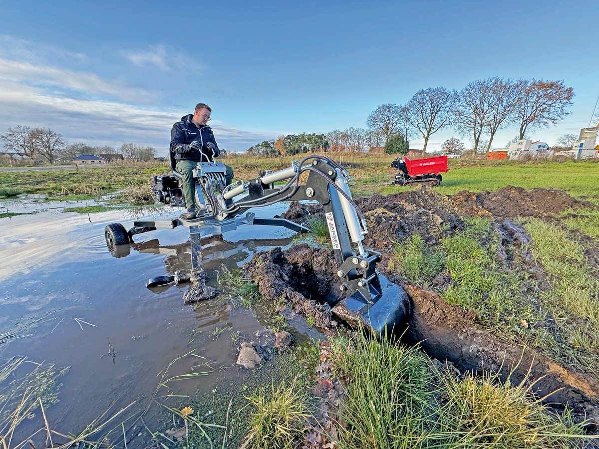 von 2 100 mm und bietet eine Löffel-Ausbrechkraft von 1,3 t sowie Stiel-Reißkraft von 600 kg. Beim Jansen »MB-360°« verrichtet ein 10 PS starker Briggs & Stratton-Benziner seinen Dienst. Hier liegt die Grabtiefe ebenfalls bei ca. 2 100 mm und Reißkraft bei etwa 550 kg. Der Mini-Schreitbagger »Kintore« von Wematik verfügt ebenfalls über ein Briggs & Stratton-Aggregat mit 9,5 PS Leistung und kommt auf eine Grabtiefe von 1 357 mm. Alle Hersteller verbauen eine AHK-Zugvorrichtung und sind mit einem 360°-Drehkranz, Schnellwechsler und Löffel ausgestattet. Dazu sind verschiedene Anbaugeräte, wie hydraulische Hämmer, Erdbohrer, Greifer aller Art usw., erhältlich.