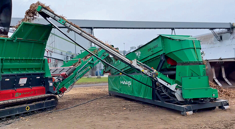 Das vorzerkleinerte Material wird anschließend dem in zwei Fraktionen mit einer Leistung von bis zu 200 m³/h trennenden Sternsieb Alva zugeführt. Als Highlight beschreibt Haas die integrierte Förderschnecke zum Sammeln und Austragen der Fein- bzw. Nutzfraktion. Das Material wird mittels der Schnecke zum Austragband gefördert. Im Vergleich zu Förderbändern sei die Schnecke wartungsfrei und sorgt für einen nahezu staubfreien Materialtransport. Kosten würden minimiert und Stillstandzeiten reduziert. Über das schwenkbare Austragband kann die Grobfraktion dem Vorbrecher erneut zugeführt werden oder wahlweise als zweite Fraktion ausgetragen werden. Neben der Altholzsiebung eignet sich das Alba-Sieb auch für vorzerkleinerte Wurzeln, für Grünschnitt, Paletten oder Papier wie auch Pappe. t