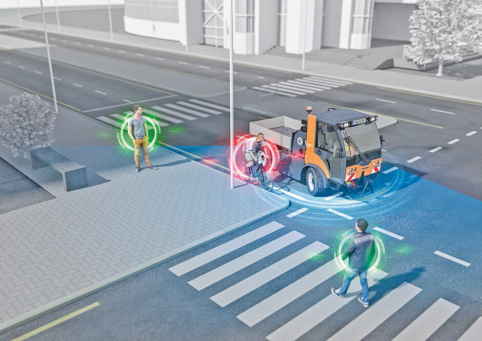 Mit dem neuen Abbiegeassistenten für Kommunaltechnikmaschinen will Hako Abhilfe schaffen. Das Kamera-Software-System der Firma Luis Technology erkennt Fußgänger und Fahrradfahrer im toten Winkel und gibt eine optische und akustische Warnung. Dabei werden statische und sich entfernende Objekte herausgefiltert.