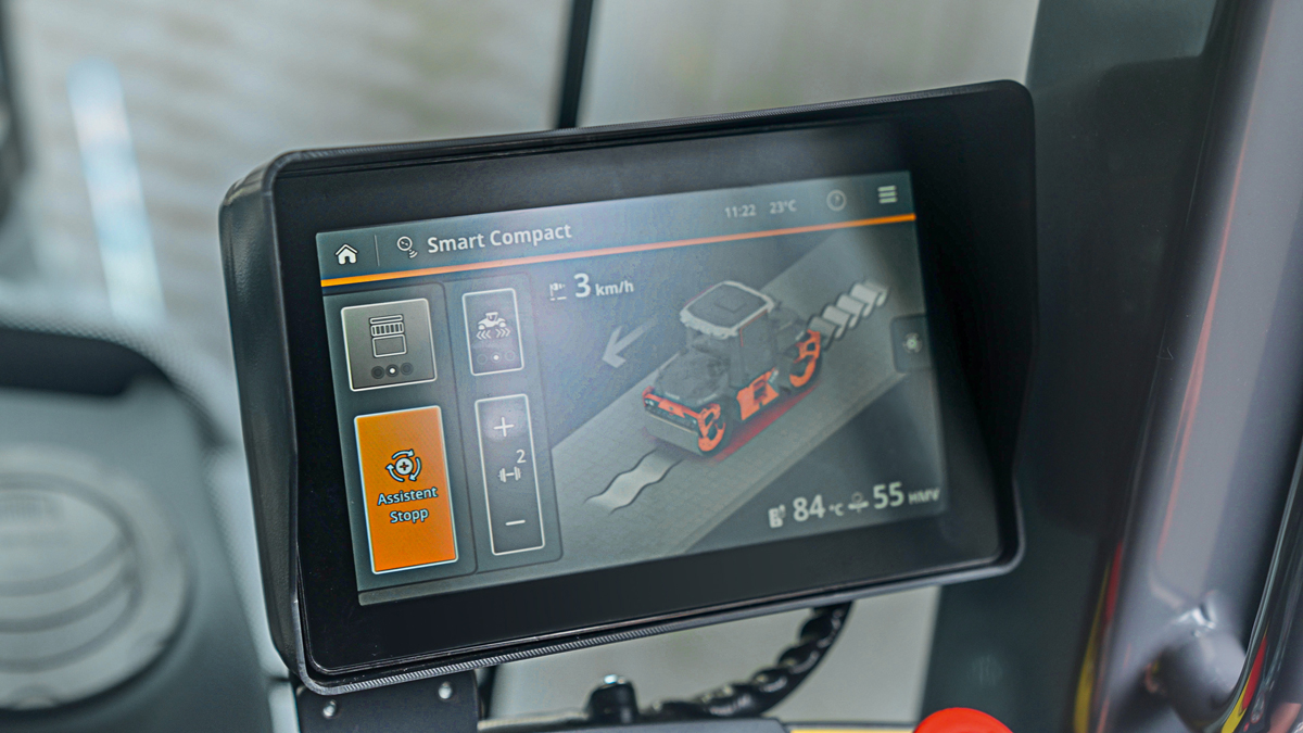 Das Besondere an der Baustelle auf der bayerischen Bundesstraße zwischen dem Schöntal und Grafenkirchen ist, dass hier mit temperaturabgesenktem Asphalt gearbeitet wird. Von den geringeren Aerosolen profitieren sowohl die Umwelt als auch die Mitarbeitenden der beauftragten Georg Huber Inh. Josef Rappl GmbH vor Ort. Gleichzeitig stellt das temperaturabgesenkte Material die Beteiligten vor Herausforderungen: Das Zeitfenster für den Einbau ist verkürzt. Unterstützung erhält der Bediener durch Smart Doc und Smart Compact. Denn sowohl durch die automatisierte Regelung der Verdichtung als auch durch die volle Transparenz über die bereits erreichten Werte werden Überfahrten effektiv reduziert. Im Umkehrschluss: Das zur Verfügung stehende, verkürzte Zeitfenster für die Verdichtung wird bestmöglich genutzt.