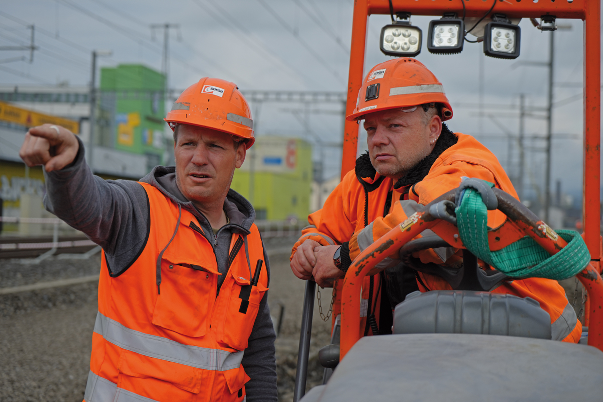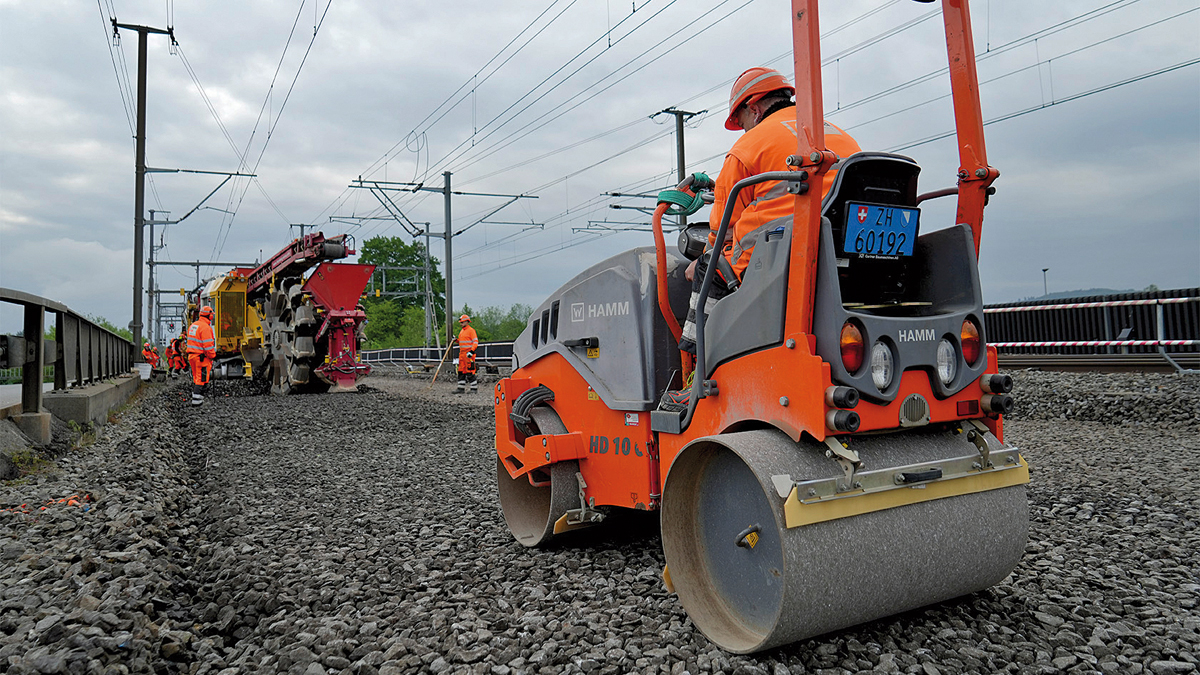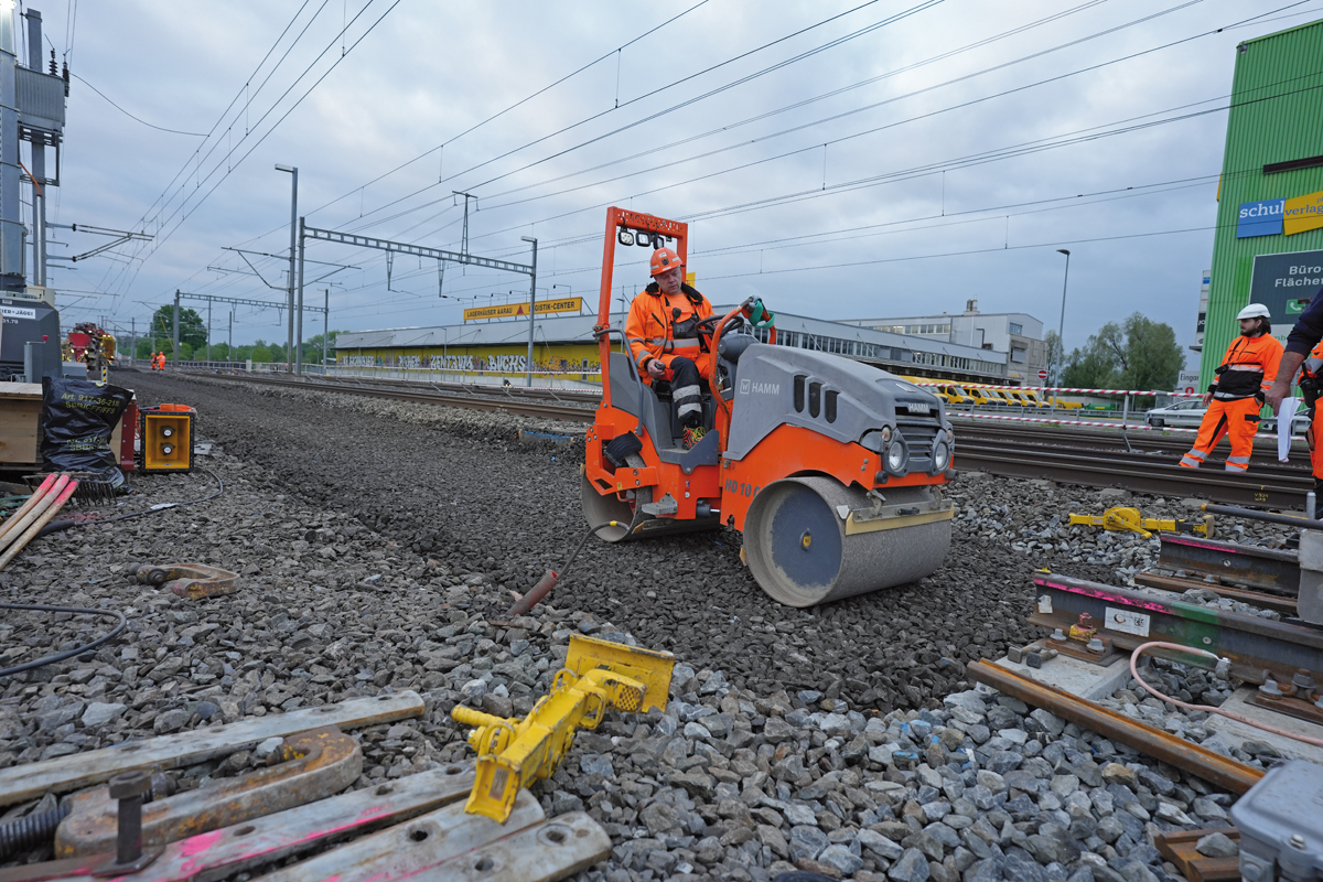 »Die HD 10C VV bietet mir alles, was ich für die korrekte Ausführung meiner Arbeit benötige. Ihre Bedienung ist intuitiv. Sie überzeugt mit optimalen Sichtverhältnissen und ausgezeichneten Fahr- und Handlingseigenschaften«, sagt René Neujahr, Bediener bei der Rhomberg Sersa Rail Group. Jürgen Franzen, Polier des bauausführenden Unternehmens, ergänzt: »Wenn in der Mitte unter einer Schwelle durch versäumtes Verdichten eine Erhebung ist, kann eine Schwelle zerbrechen. Das ist dann noch einigermaßen gut behebbar, wenn es eine Streckenschwelle ist. Aber in einer Weichensituation wie hier in Aarau können wir keine andere Weiche darunter reinziehen. Dann stünde alles erst einmal still. Man kann es zwar dann stopfen, aber man muss dann auch die Schwelle danach noch einmal ausbauen und das wirklich umbauen. Unsere Hamm Walze hilft, das zu verhindern.«d