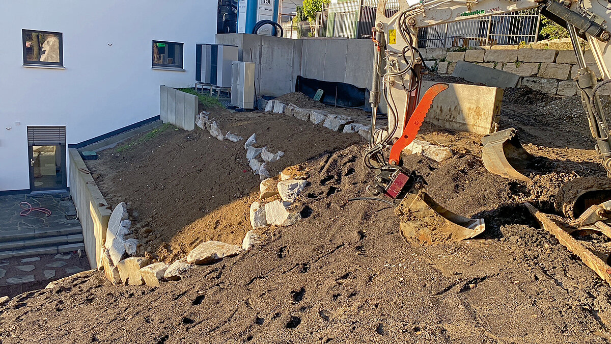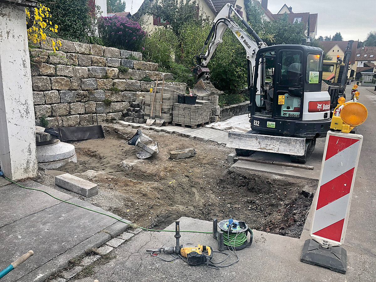 Es liegt auf der Hand, dass einige dieser Arbeiten mit viel Handarbeit und Fingerspitzengefühl umgesetzt werden müssen, da sie nicht von Maschinen übernommen werden können. Somit ergibt es Sinn, wenn schwere Erdarbeiten wie das Planieren und Modellieren von Flächen und Abhängen oder das Setzen von Steinen durch die präzise Arbeit des Baggers erledigt werden können, sodass sich Mitarbeiter auf andere Aufgaben konzentrieren können. Daher hat Jan Sauter alle seine Bagger von Bobcat, die in den Gewichtsklassen zwischen 1 und 9 t liegen, mit einem »RotoTop« ausgestattet. Der »E80« stammt dabei aus dem Jahr 2016, sodass Sauter inzwischen gut neun Jahre Erfahrung mit dem Drehantrieb von Holp hat. Schon vor mehr als zehn Jahren ist Jan Sauter auf einer GaLaBau-Messe auf den »Rototop« gestoßen und hat sich seinerzeit von Günter Holp die Idee der Endlosdrehung und der damit verbundenen Flexibilität erklären lassen. Danach verging noch einige Zeit, bis er 2016 den ersten Bagger mit »RotoTop« ausstattete.