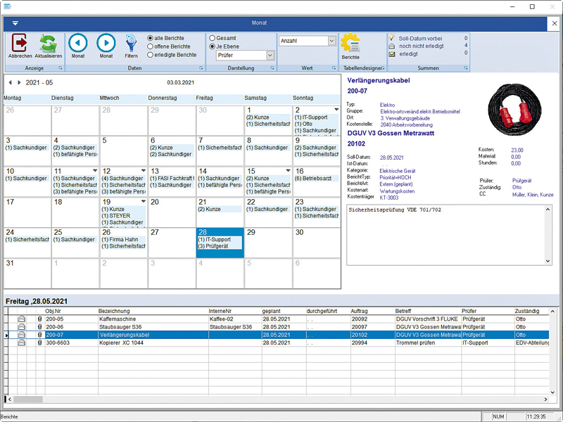 Besser ist ein Tool, das auf die Betriebsmittelwartung zugeschnitten ist und über sämtliche Wartungs- und Instandhaltungsvorschriften sowie einen Kalender zur Planung verfügt. Optimal ist eine Funktion, mit der in Prüfberichten entsprechende Wartungsaufträge generiert werden können. Eine Software für das Wartungs-Management ermöglicht den Fachkräften für Arbeitsschutz und -sicherheit sowie EHS-Managern, per Klick Dokumente zu erstellen, zu archivieren und zu pflegen. Sie erfasst alle Prüfgegenstände und die relevanten Objektdaten. Zusätzlich können weitere Daten wie Bilder hinterlegt werden. Der »Wartungsplaner« der Hoppe Unternehmensberatung beispielsweise ist in den Klassifikationen Wartung, Prüfung, Reparatur, Instandsetzung sowie Prüftermin und Unterweisung unterteilt. Wichtige Instandhaltungskennzahlen werden grafisch aufbereitet und können im- und exportiert werden.