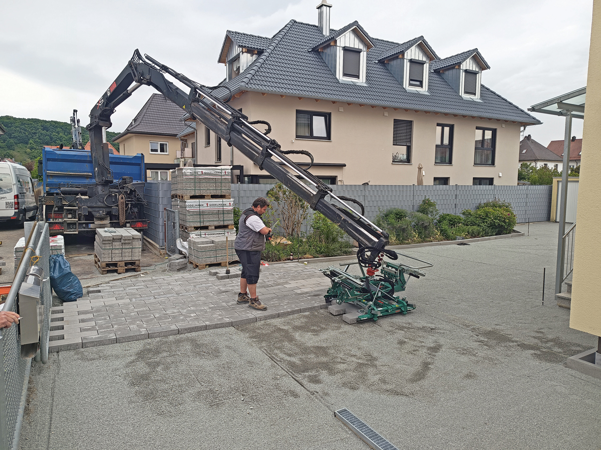 Für den Testeinsatz wurde die »HP30« an einem Ladekran montiert, der sich besonders für kleinere Baustellen eignet. Der Lkw fährt rückwärts an die Einfahrt, sprich Pflasterfläche heran, und der Heckkran reicht mit einer Ausladung von bis zu 14 m in der Regel für die kurze Fläche aus. Zum Vergleich und als weiteren Test wurde der »Tetrago«-Öko-Fugenstein 8,5 mm von Godelmann mit einem »ET90«-Bagger verlegt. Die Kombination aus feinfühliger Steuerung des Baggers und der »HP30« erwies sich hier als äußerst präzise und effizient. Diese Kombination ist für Situationen gedacht, wo der Lkw nicht sinnvoll ist. Martin Aumer, Geschäftsführer der Aumer Bau GmbH, war positiv überrascht: »Die ›HP30‹ hat unsere Erwartungen übertroffen und erleichtert die Verlegung der versickerungsfähigen Pflastersteine enorm. Das spart Zeit und schont die Mitarbeiter. Die ›HP30‹ wird künftig bei jeder passenden Baustelle eingesetzt.«d
