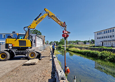 Das Argument, nicht viele Maschinen auf der Baustelle haben zu müssen, sondern mit der einen effizienten Maschine alles zu machen, beschreibt die unterschiedlichen Alleinstellungsmerkmale des City-Baggers aus Dänemark. „Es gibt keinen weiteren Mobilbagger, der gleichzeitig so kompakt, groß und kräftig und vielseitig einsetzbar ist, wie der Hydrema“, meint Werthenbach und führt weiter aus: „Der MX14 beispielsweise ist so kompakt, dass er sich dort drehen kann, wo sich gerade einmal 5 t Minibagger schwenken können und doch holen wir mit dem MX14G bei Bedarf ein 8 t schweres Gewicht aus dem Boden heraus. Gleichzeitig ist die hydraulische Leistung aller MX so kräftig ausgelegt, dass es keine Einschränkungen beim Einsatz mit schweren hydraulischen Anbaugeräten gibt. Insgesamt 407 Liter pro Minute, dabei ein eigenes ZF-Schwenkgetriebe, das mit 88 l gespeist wird, so dass noch 319 l für die Arbeit mit der Maschine zur Verfügung stehen, lassen den Bagger auch bei schweren Arbeiten mit Mulcher oder Ramme nicht lahm werden, sondern er behält seine feinfühligen und flinken Bewegungseigenschaften. Also arbeiten und gleichzeitig fahren, schwenken, und heben sind für den MX18G genauso wenig eine Herausforderung, wie das Heben von extrem schweren Baukörpern. Und je nachdem, was, bzw. in welcher Reichweite das Gewicht gehoben werden muss, müssen die Anbauwerkzeuge noch nicht einmal abgebaut werden. Auch diese Zeitersparnis ist aus Kundensicht beachtlich, denn nicht alle Kunden arbeiten mit vollhydraulischen Schnellwechslern. Und wenn dann erst ein Greifer mühsam abgekuppelt werden muss, nur um ein schweres Gewicht auf der Baustelle zu versetzen, ist das nicht nur beschwerlich und anstrengend für das Baustellen-Team, sondern kostet auch wertvolle Zeit. Mit der Roadshow machen wir es jetzt möglich, all diese Faktoren live zu erleben.“