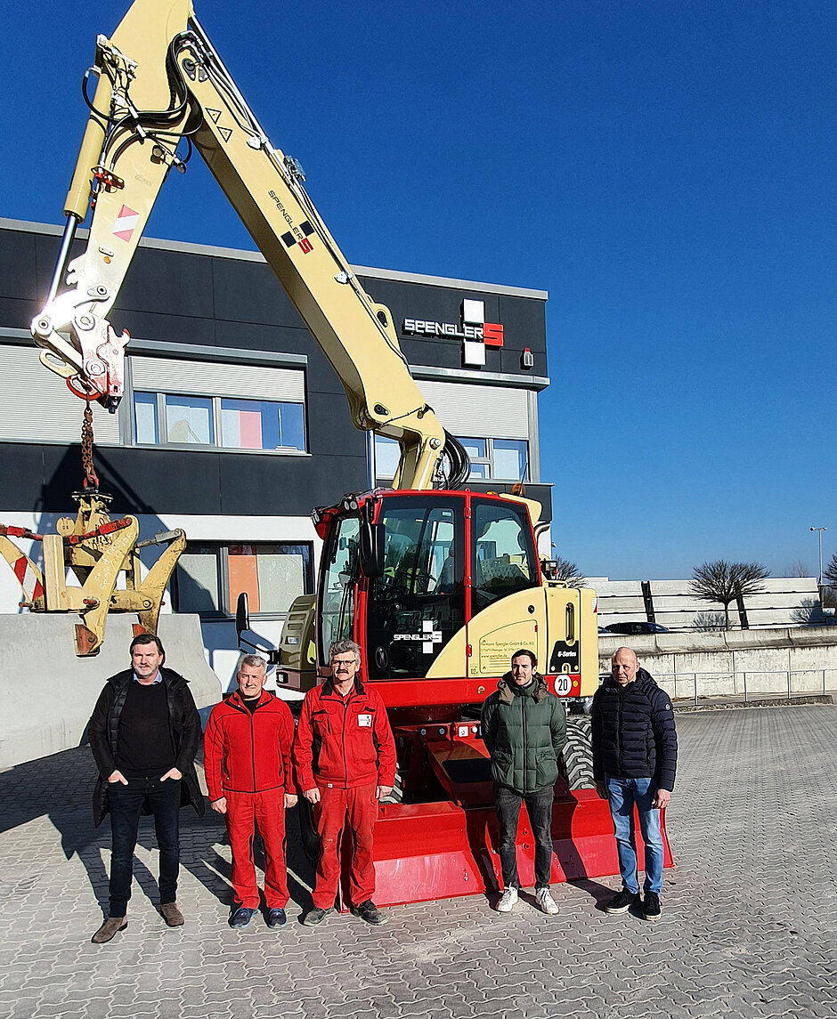Da die Firma Spengler aber nicht nur produziert und liefert, sondern auch die Rückhaltesysteme selber aufstellt, sei die Herausforderung an die Maschinentechnik groß und mit den Anforderungen auf den Baustellen weiter gewachsen. In mittlerweile vierter Generation unterstützt Florian Spengler seine Eltern in der Geschäftsführung des Familienunternehmens und berichtet dem Baumaschinenhändler Engelhardt aus dem benachbarten Schopfloch von den Ansprüchen, die an eine Maschine gestellt werden, die auf den Baustellen unterstützen soll. „Die Baustellen werden für uns immer beengter, zumal wir oft auch bei weiter laufendem und fließendem Verkehr arbeiten müssen. Gleichzeitig werden aber auch die Bauelemente immer länger und damit auch schwerer.“ Die Herausforderung sei also eine Maschine zu finden, die kompakt und gleichzeitig kräftig ist, aber zusätzlich auch über eine große Reichweite verfügt. Erich Engelhardt gilt in der Region nicht nur als technisch äußerst erfahrener Fachmann, sondern hat mit seinem vorbildlich ausgestatteten Unternehmen einen exzellenten Ruf, wenn es darum geht, die passende Maschine für besondere Einsätze zu finden. Er verkauft Maschinen von Hyundai, Yanmar und eben auch von Hydrema und könne damit sofort die passende Antwort geben, denn natürlich sei für das Unternehmen Spengler ein Kettenbagger auf den Baustellen nicht einzusetzen.