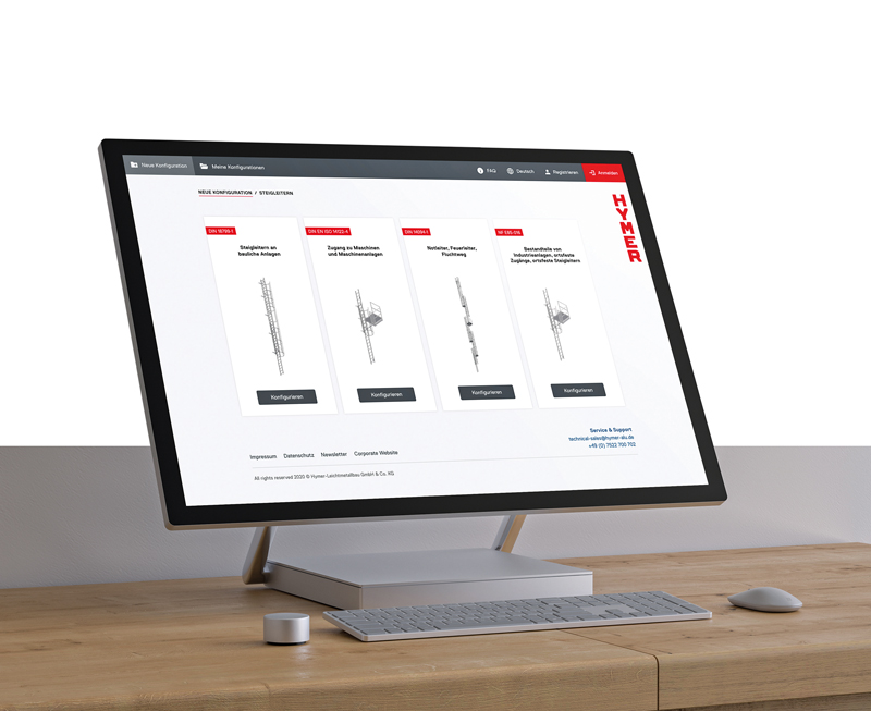 Mit dem neuen Steigleiter-Konfigurator hat Hymer-Leichtmetallbau das bisher Flash-basierte 2D-Tool zu einem intuitiv zu bedienenden 3D-Modell gewandelt. Mit wenigen Mausklicks ist eine Steigleiter für die Baustelle oder Industrieanlage konfigurierbar. Für Realtime-3D-Daten sorgt eine direkte Anbindung an das CAD-System Inventor. Mit wenigen Mausklicks kann ein Bauleiter oder Industrieanlagenplaner die gewünschte Steigleiter konfigurieren. Startet er die Online-Anwendung, kann er zwischen vier Varianten auswählen: für bauliche Anlagen, für Maschinen und maschinelle Anlagen sowie für Bestandteile von Leitern für Industrieanlagen und Notleitern der Feuerwehr und Fluchtwege. Ist die Steigleiter konfiguriert, wird automatisch im Hintergrund ein Angebot erstellt. Per Bestell-Button kann die konfigurierte Leiter geordert werden und ist spätestens nach vier Tagen beim Kunden auf der Baustelle. Selbst wenn man beim Konfigurieren feststellt, dass doch eine kundenspezifische Lösung notwendig ist, hat man bereits die Basis dafür. Schnell ist dann mit dem Vertriebsinnendienst die Abweichung oder der Aufbau an der Fassade geklärt. t