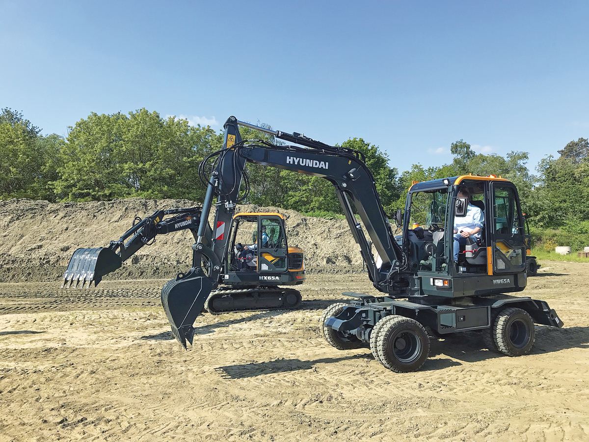 Die zwei neuen Modelle Seite an Seite: der Raupenbagger HX65A und der HW65A mit Zwillingsbereifung.