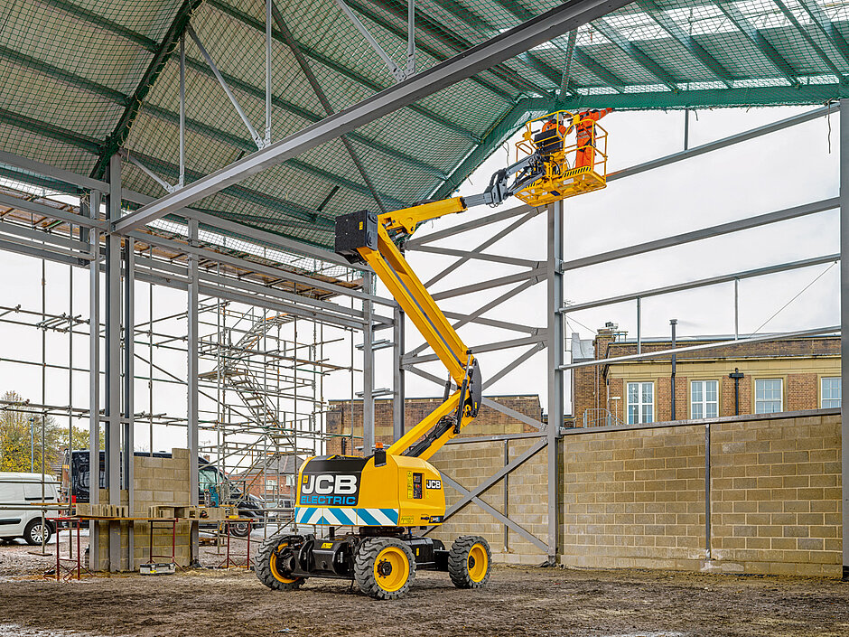 Laut JCB ist die Arbeitsbühne A45E eine vollelektrische Version des Diesel-Modells AJ48D und bietet die gleiche Leistung, Arbeitshöhe sowie Reichweite – jedoch emissionsfrei. Dabei wird sie von acht 6-V-Batterien angetrieben, die ein 48-Volt-System mit 400 Ah bilden. Die Batteriepakete sind auf beiden Seiten des unteren Chassis angeordnet, wodurch ein niedriger Schwerpunkt für zusätzliche Stabilität und verbesserte Traktion gewährleistet sei. Die Batterien versorgen die AC-Antriebsmotoren über die Motorsteuerung und die Hydraulikpumpe der Maschine über eine Hydraulikmotorsteuerung.