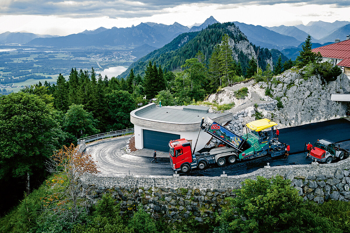 Die etwas mehr als 2 km lange Straße zur Burgruine ist abschnittsweise nur 3 m breit und schon in die Jahre gekommen. Die Strecke ist holprig und weist tiefe Schlaglöcher auf. »Die Baustelle hat sehr viele Raffinessen. Wir haben es mit starkem Gefälle und gleichzeitig sehr engen Kurven zu tun. Das ist eine Herausforderung für den Einbau und die Logistik«, beschreibt Sascha Böck, Geschäftsführer der beauftragten Josef Böck GmbH, die Aufgabe. Er hat den Einsatz im Vorfeld akribisch geplant. Für die Mischgutanlieferung können wegen der Spitzkehren nur Dreiachser-Lkw eingesetzt werden. Hinzu kommt, dass auf der zu bewältigenden Strecke nur bedingt Ausweichstellen vorhanden sind. Die Lkw müssen über weite Abschnitte rückwärtsfahren. Entscheidend für eine qualitativ hochwertige Ausführung ist außerdem ein flexibler und leicht bedienbarer Straßenfertiger.