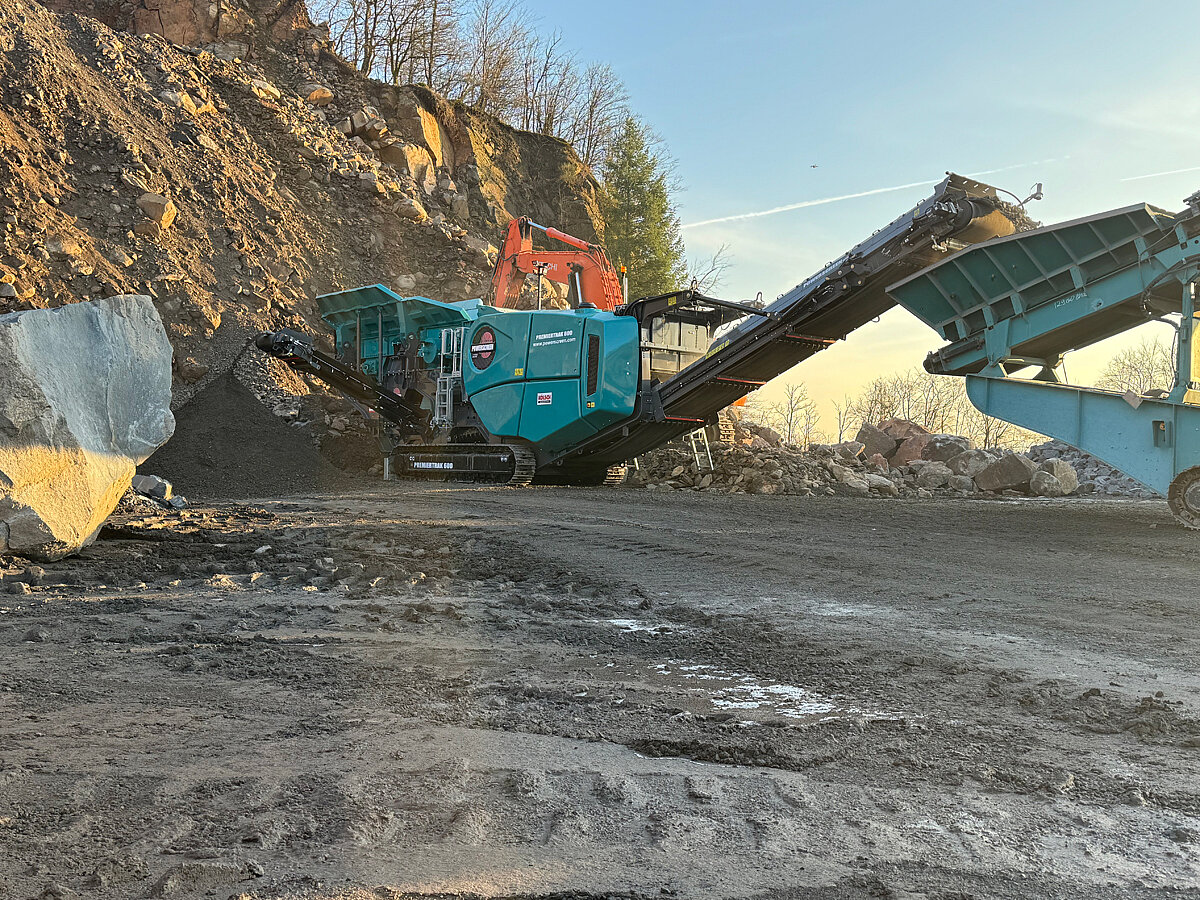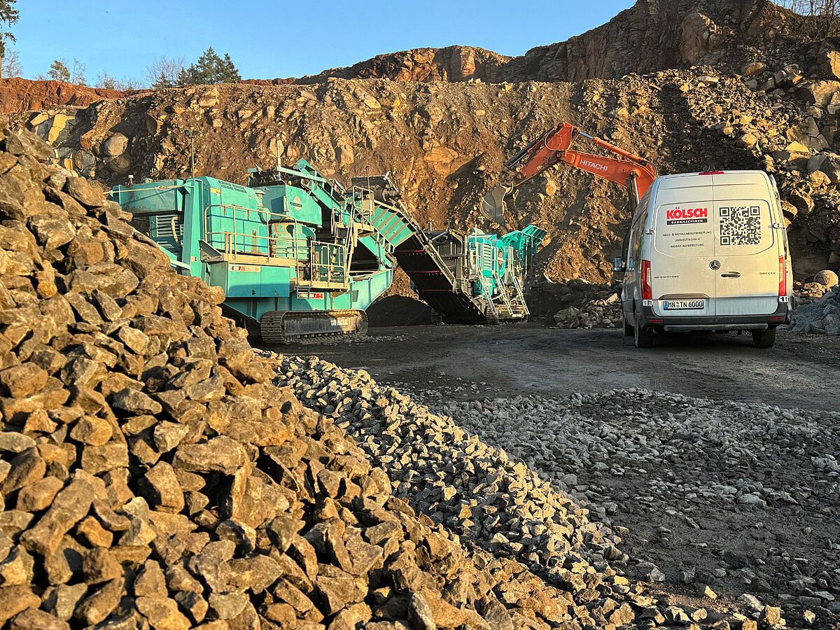 Seit 2010 begleitet Kölsch das Gewinnungsunternehmen und versorgt es mit Maschinen, Lösungen und schnellem, kompetenten Service. In der Basaltgewinnung sind in diesem Betrieb zwei Powerscreen-Züge simultan im Einsatz.