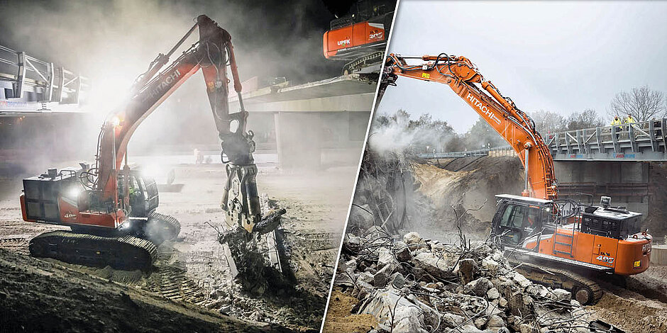 Das Vorhaben klingt anspruchsvoll und ist es auch. Nicht zuletzt, weil über Nacht gearbeitet werden muss und dabei Baumaschinen mit unterschiedlichen Anbaugeräten ohne Unterbrechungen zum Einsatz kommen. Peter Steltner, Prokurist bei Upek, weiß genau, worauf es beim Brückenabriss ankommt: Einerseits sollen fähige Mitarbeiter in den Baggern sitzen, andererseits muss auch auf die Technik Verlass sein. Auch wenn der eigene Maschinenpark von Upek gut bestückt ist und bei diesem Projekt der KMC600P-6 von KTEG und der Hitachi ZX300LCN-6 eingesetzt werden, greift man dennoch bei komplexen Baumaßnahmen auf die zeitlich begrenzte Nutzung von gemietetem Equipment zurück. Der Abbruch-Spezialist betont: »Der Kiesel Mietpark ist für uns von Vorteil, da leistungsstarke Bagger und passende Anbaugeräte kurzfristig für Auftragsspitzen verfügbar sind.« Und Niklas Pieters, Mietparkleiter der Niederlassung Bielefeld von Kiesel Nord, bestätigt: »Da der Bagger projektbezogen eingesetzt werden sollte, hat sich die Firma Upek für das Mieten eines Hitachi-Großbaggers entschieden. Gemeinsam hatten wir die Aufgabenstellung detailliert besprochen, sodass wir die passende Maschine inklusive Zubehör auswählen konnten. Mit diesem Setup boten wir dem Kunden die perfekte Maschinengrundlage für den anspruchsvollen Brückenabriss.«