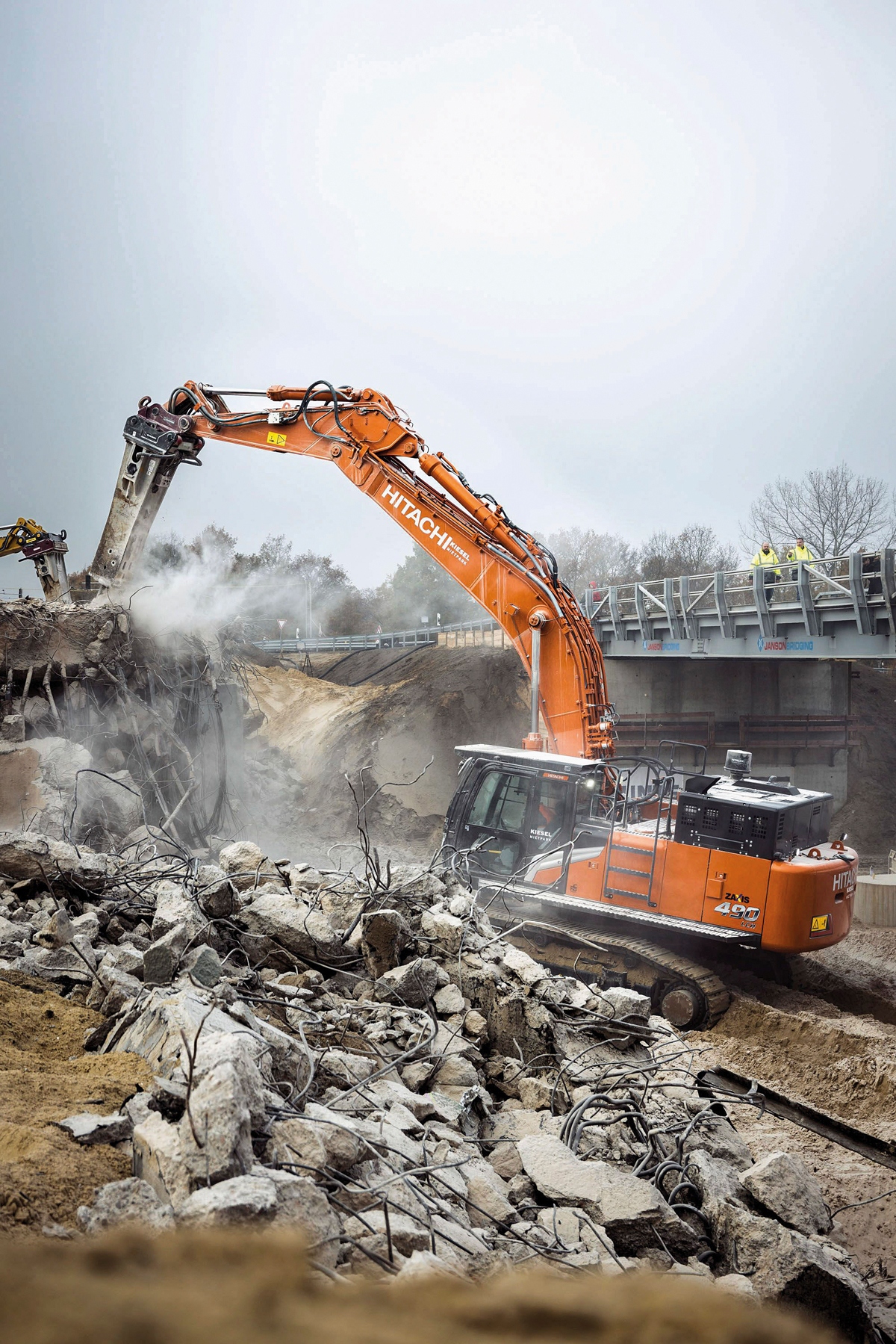 Die Wahl fiel auf den Kettenbagger Hitachi ZX490-7, den der Kiesel Mietpark zusammen mit der Demarec DCC65 Abbruchschere und dem MTB405DHX Hydraulikhammer lieferte. Die Maschine der neuesten Generation verfügt über einen großvolumigen 15,7 l Isuzu-6-Zylinder-Niederemissionsmotor 6WG1, einen mechanisch verstellbaren Unterwagen für höhere Standfestigkeit sowie eine Zentralschmieranlage. Das leistungsstarke Arbeitsgerät ist – wie auch die anderen beim Brückenabriss eingesetzten Bagger – mit einem OilQuick-System ausgestattet, das den schnellen Wechsel der Anbaugeräte ermöglicht. Die überarbeitete Kabine trägt durch ergonomisch angeordnete Bedienelemente und dank der Panoramaverglasung zu einem hohen Fahrerkomfort bei.
