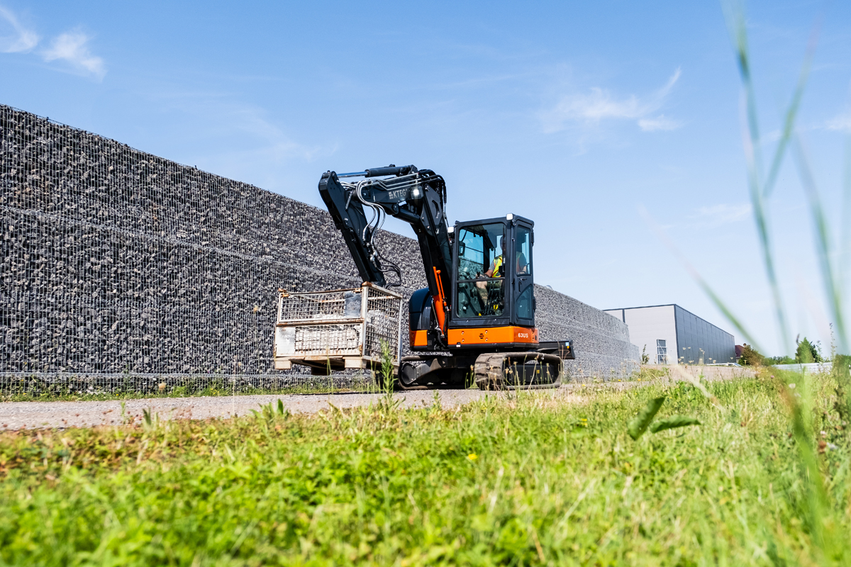 Der Clou an dieser Maschine ist, dass hier das Konzept mit einem neben der Kabine angelenkten Ausleger von einem großen Kettenbagger auf eine Kompaktmaschine übertragen wurde. »Dadurch können wir höhere Hubkräfte, also konkret 2,5 t bei 2,5 t Ausladung, erzielen«, erklärt Mesmer. Hinzu kommt, dass so die Sicht auf den Arbeitsbereich nicht durch einen Schwenkbock vor der Kabine beeinträchtigt wird. Durch den Rotationsschnellwechsler hat der Fahrer dennoch eine sehr große Flexibilität, um alle erforderlichen Maßnahmen umsetzen zu können. Das ist für jeden Fahrer eine riesengroße Erleichterung. Mit dem neuen Kompaktbagger KTEG 63US-6 bringt Kiesel einen Allrounder auf den Markt, der auf beengten Baustellen und auf minimalem Raum mehr kann als andere Maschinen. »Hinten kurz, vorne kurz und ein kompakter Verstellausleger«, so Mesmer, »da freuen sich die Baggerfahrer. Alles ist da, wie gewünscht. An dieser Stelle ist die Geschichte aber noch nicht zu Ende.« Der umgebaute Kompaktbagger wird auf der Testbaustelle im Coreum auf Herz und Nieren geprüft, bevor der Bauunternehmer, der den Wunsch geäußert hatte, ihn testen kann.