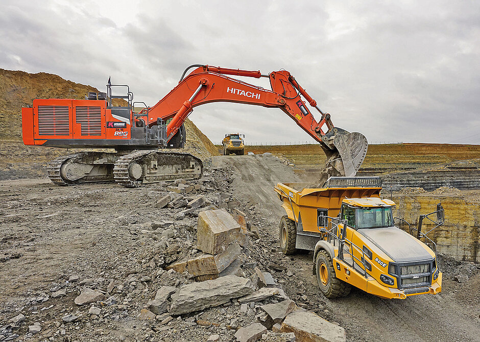 Bereits seit einigen Jahren setzt Kurz Baumaschinen bei seinen Großgeräten konsequent auf die Zusammenarbeit mit Kiesel. Alle schweren Kettenbagger ab ca. 30 t Betriebsgewicht sowie die Großradlader ZW310, ZW330n und ZW370 kommen von Hitachi. Im Ladebetrieb mit den ZX300 bzw. ZX350, den 50- bzw. 70-Tonnern ZX490 und ZX690 sowie dem Großbagger Hitachi ZX890 arbeiten insgesamt 15 knickgelenkte Muldenkipper von Bell Equipment – neben diversen 30- und 40-Tonnern insbesondere auch die dank hoher Nutzlastreserven besonders flexibel einsetzbaren Bell B45E mit nominellen 41 t Nutzlast.