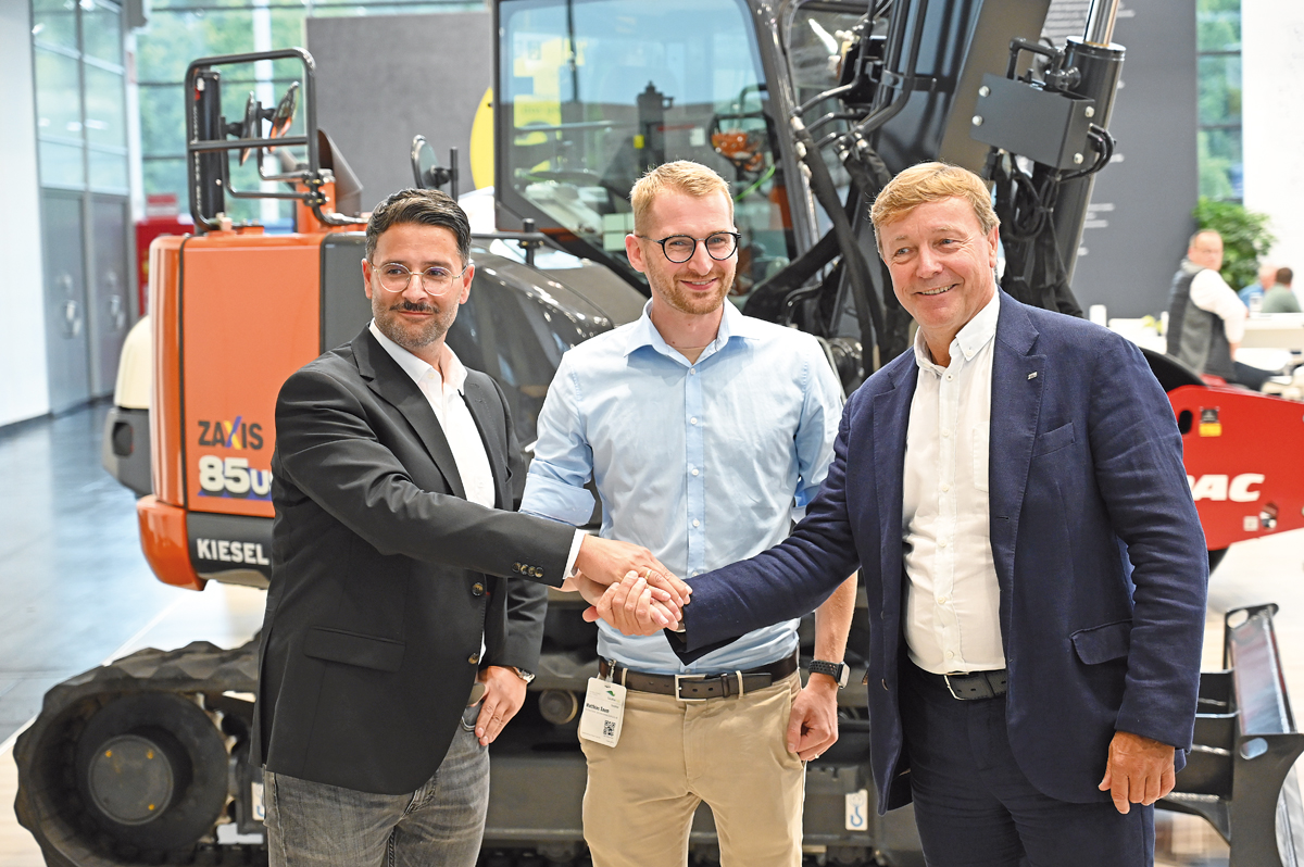 Das Debüt auf der GaLaBau und ein großer Auftritt auf der Bauma: Gökmen Durak (Vertriebsleiter Kiesel Süd), Matthias Saum (Geschäftsführer Paul Saum Garten- und Landschaftsbau) und Toni Kiesel (Geschäftsführender Gesellschafter, Kiesel GmbH; v. li. n. re.) feierten im Rahmen der Nürnberger GaLaBau Mitte September die Premiere der neuen »P-Line by KTEG«: Wir freuen uns sehr, dass wir die P-Line heute an Paul Saum Garten- und Landschaftsarchitekten aus Hohenfels übergeben konnten«, so Toni Kiesel. »Da steckt viel Herzblut drin! Wir bieten mit der P-Line unseren Kunden eine perfekte Systemlösung an. Seit Jahrzehnten dreht sich bei uns schon alles um Kundenbelange in den unterschiedlichen Branchen. Wir von Kiesel möchten gemeinsam mit unseren Kunden die Prozesse optimieren, das ist heute wichtiger denn je.« d