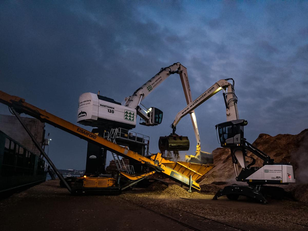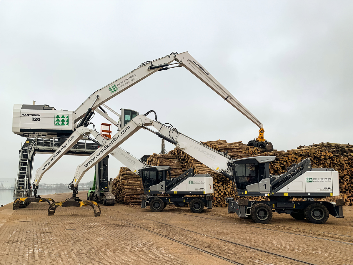 Wird der Mantsinen seeseitig bei den Schiffen eingesetzt, performen die beiden Fuchs MHL340F auf dem Platz. Einer der beiden MHL340F beschickt den Hacker, der andere ist mit dem Be- und Entladen von Waggons und LKW beschäftigt. Als Anbaugeräte werden zumeist unterschiedlich große Holz- und Schalengreifer genutzt, analog zum Mantsinen. Schifffahrtskaufmann Lefold muss aufs Geld schauen, und da sind die Fuchs MHL340F wirtschaftlich gesehen „fast noch wichtiger als der Mantsinen“, denn die Maschinen laufen im materialintensiven Holzumschlag den ganzen Tag. Bisher gab es laut Lefold keine Ausfälle und die Dieselkosten seien deutlich geringer als bei den Vorgängern.