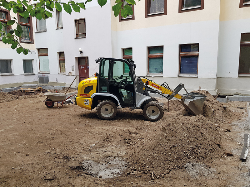 Der Innenhof eines Wohnhauses sollte innerhalb von sechs Wochen komplett saniert werden und mit Grünflächen sowie einem Holz-Carport für Fahrräder und Mülltonnen ausgestattet werden. Frank Ambrasat war bei diesem Auftrag als selbstständiger Subunternehmer für die Firma Innabau tätig, die sich primär um Außenbau und Sanierungsarbeiten von Wohnhäusern kümmert. Für die Baustelle wurde ein Radlader benötigt, der problemlos durch die enge Einfahrt fahren und auf kleinem Raum sicher und gezielt arbeiten kann. Zudem sollte die Baumaschine leistungsstark sein und über einen großen Schaufelinhalt verfügen. Auf dem Online-Mietportal klickrent fand Ambrasat schnell die richtige Maschine und konnte diese direkt buchen. Produktspezifische Fragen zu der für ihn interessanten Maschine klärte der klickrent-Kunden-Support, sodass keine Unklarheiten zur Eignung der Maschine offen blieben. Durch die eindeutige Angabe des Einsatzortes und des Lieferzeitpunkts wurde die Baumaschine wunschgemäß geliefert und Ambrasat konnte mit seinen Bauarbeiten beginnen.